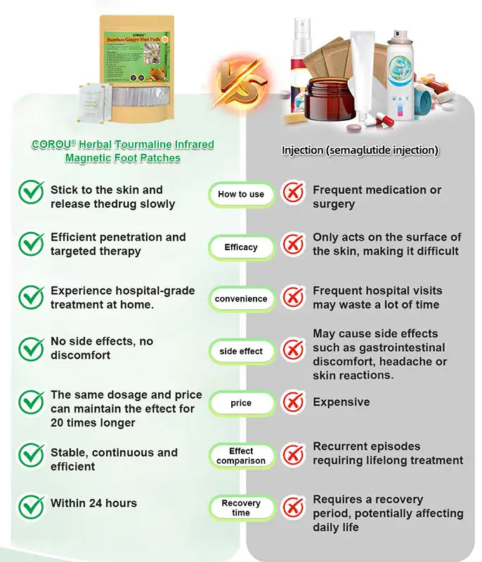 COROU® Magnetic Therapy Foot Patches demonstrate significant advantages in diabetes management. They enhance cellular metabolism and insulin sensitivity through far-infrared radiation, while negative ions improve blood circulation, reduce inflammation, and protect nerve health. This helps lower the risk of complications from high blood sugar and restores sensitivity to pain, temperature, and pressure. Additionally, the inclusion of cinnamon aids in regulating blood sugar levels and further supports vascular health. These combined effects provide effective support for the overall health of diabetes patients.