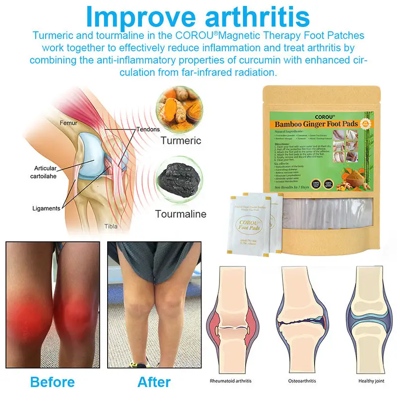 COROU® Natural Herbal Tourmaline Far Infrared Magnetic Therapy Foot Patches are formulated with a blend of potent ingredients to alleviate arthritis symptoms. Turmeric contains curcumin, a powerful anti-inflammatory compound that helps reduce joint inflammation and pain caused by arthritis. Cinnamon also offers anti-inflammatory benefits, helping to reduce swelling and discomfort. Additionally, tourmaline emits far-infrared radiation that enhances blood circulation and promotes cellular repair, further supporting joint health and alleviating arthritis-related symptoms. These ingredients work synergistically to relieve pain and improve overall joint function for arthritis sufferers.