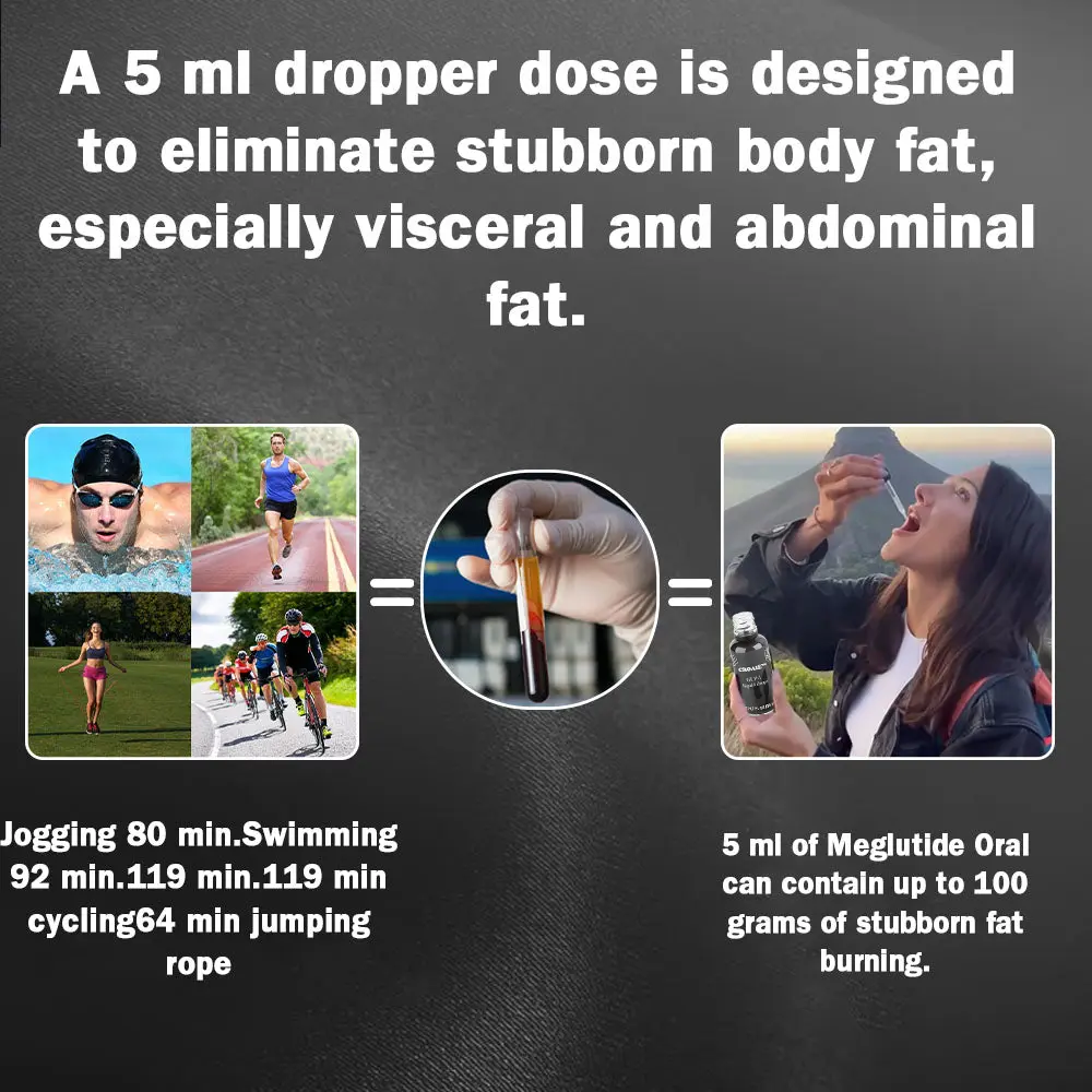 Studies have shown that 5 ml of Meglutide Oral Solution can burn up to about 100 grams of stubborn fat. And it takes a long time to burn 50 grams of fat through exercise (80 minutes of jogging, 92 minutes of swimming, 119 minutes of cycling, 64 minutes of jumping rope). The dose of one dropper is 5 ml and is specifically designed to burn and eliminate stubborn fat from the body, especially effective in reducing visceral and abdominal fat.