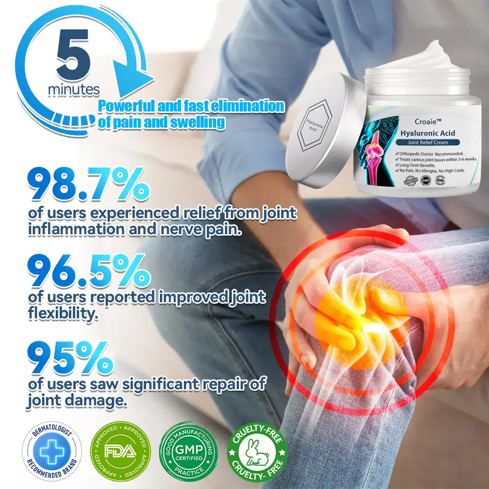 Do you experience stiffness or limited joint mobility? Introducing CROAIE™ Hyaluronic Acid Joint Relief Cream – a groundbreaking solution designed for your needs. Utilizing advanced nanotechnology, this powerful cream combines the benefits of hyaluronic acid with natural, effective ingredients. Specifically formulated for arthritis sufferers, this cream offers a non-invasive alternative to traditional injections, letting you enjoy freedom of movement once again.