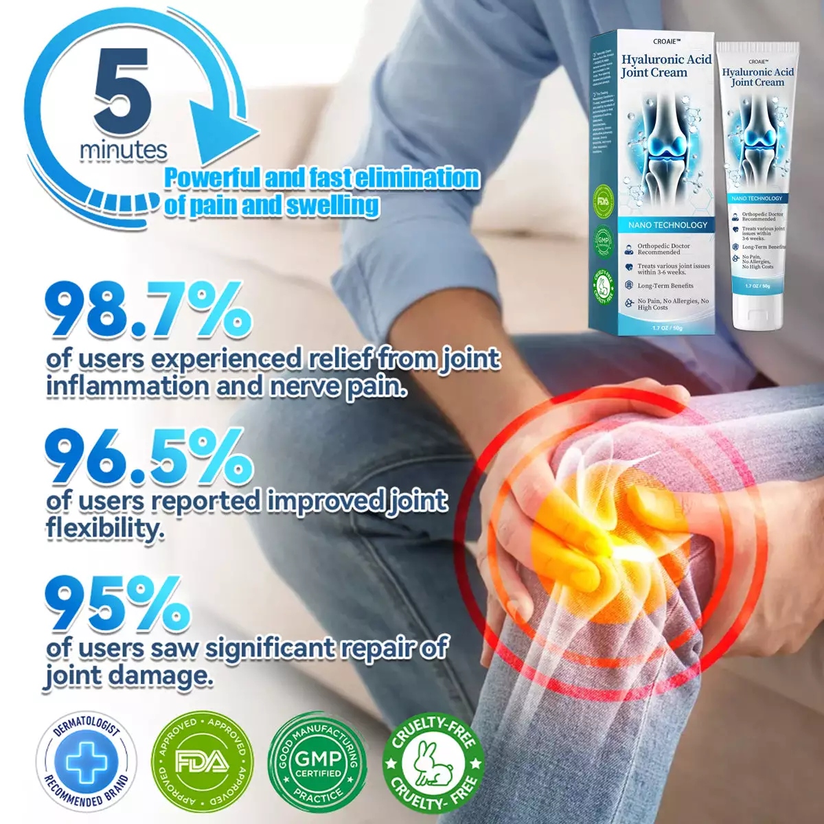 Whether it’s stiffness, swelling, or discomfort, CROAIE™ Hyaluronic Acid Joint Repair Cream is the breakthrough solution you’ve been waiting for. Clinically approved by doctors, this advanced cream leverages cutting-edge nanotechnology to deliver hyaluronic acid and natural active ingredients directly to the joints, providing relief from arthritis and other joint-related conditions—without the need for injections or surgery!
