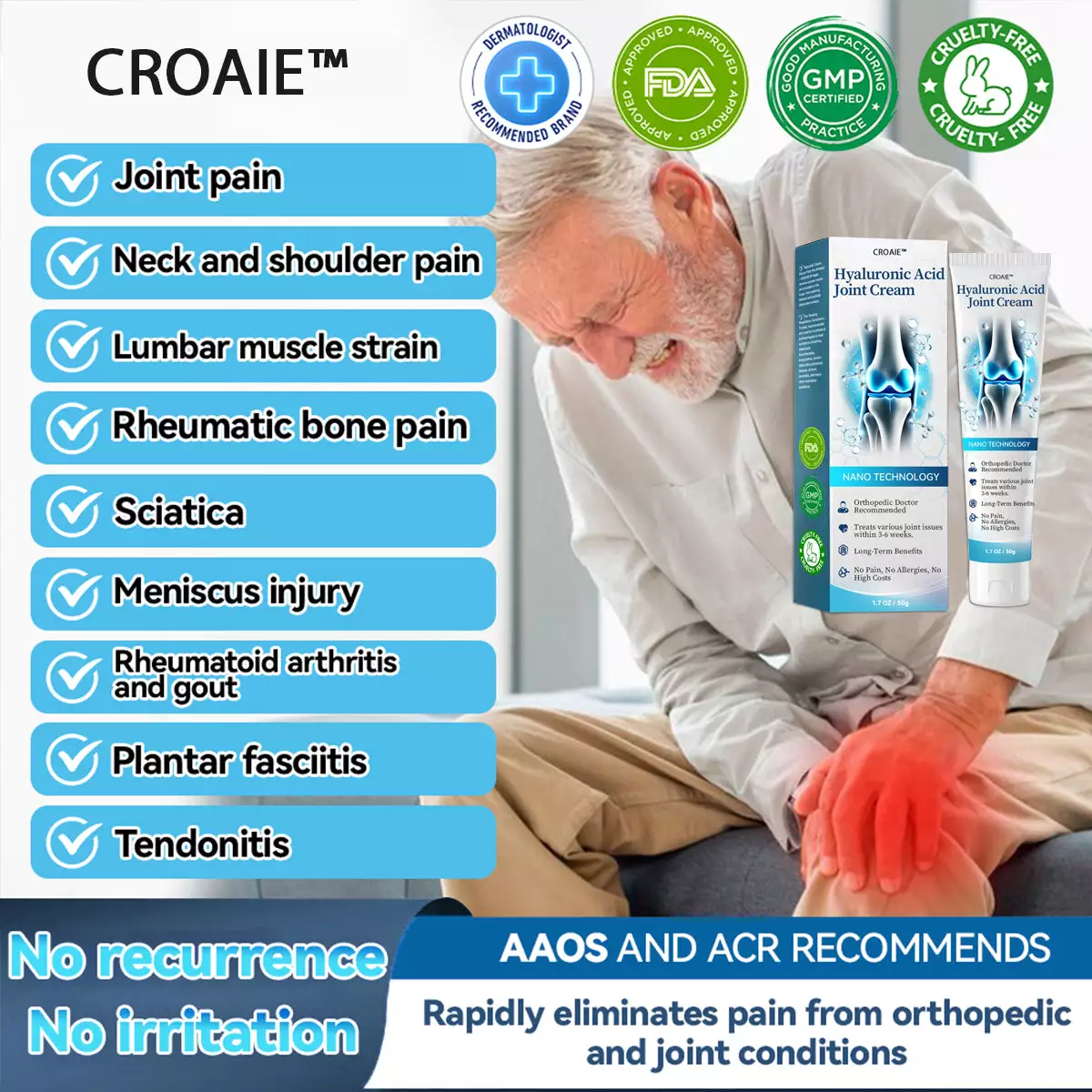 Start using CROAIE™ Hyaluronic Acid Joint Repair Cream today and take the first step towards a pain-free, active life. Say goodbye to joint pain, stiffness, and inflammation—and embrace the freedom to move without discomfort!