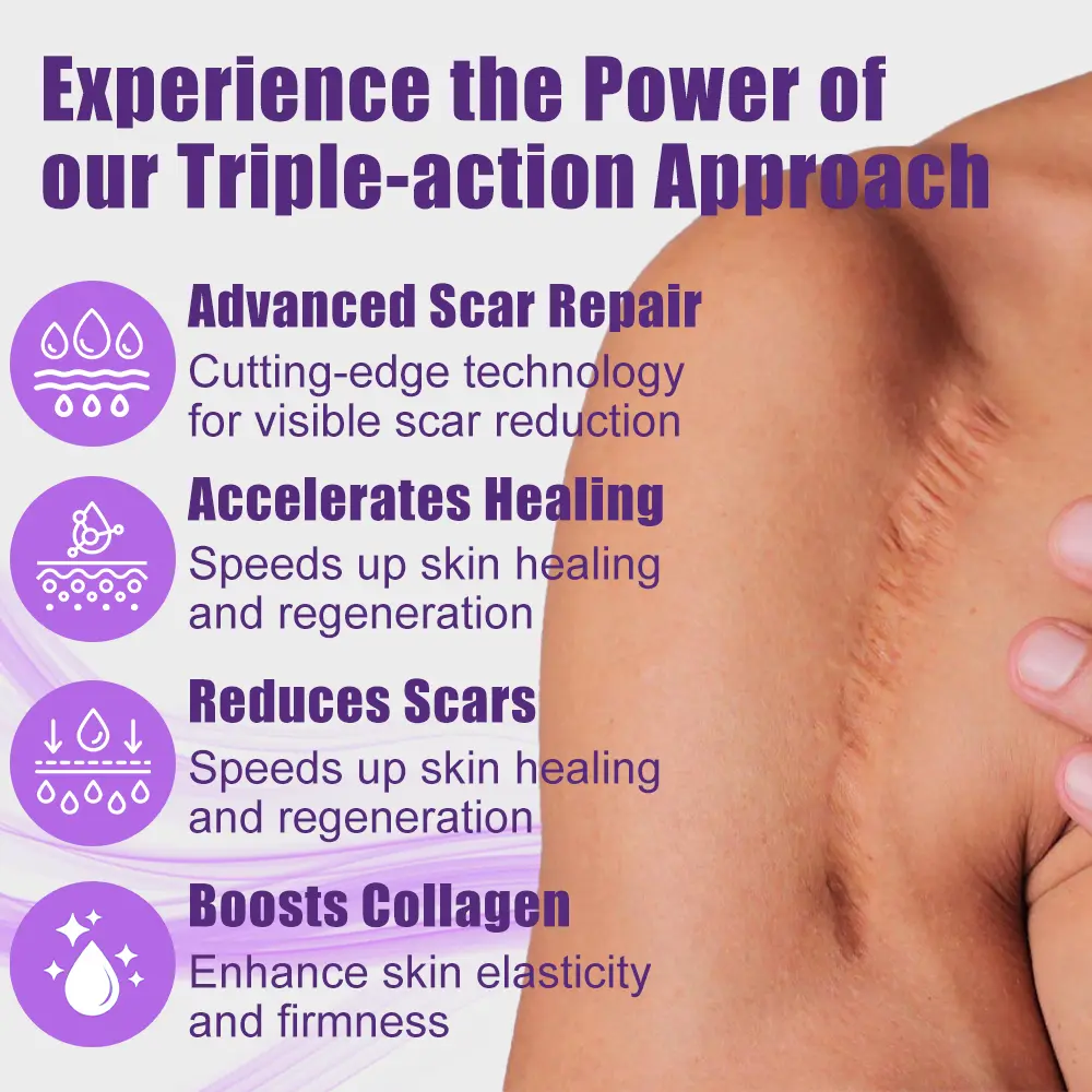 No matter what type of scar you have—surgical scars, acne scars, burn scars, stretch marks, keloids, or hyperpigmentation—our product works effectively to fade scars quickly, promote skin regeneration, and restore your skin’s smooth and healthy appearance.