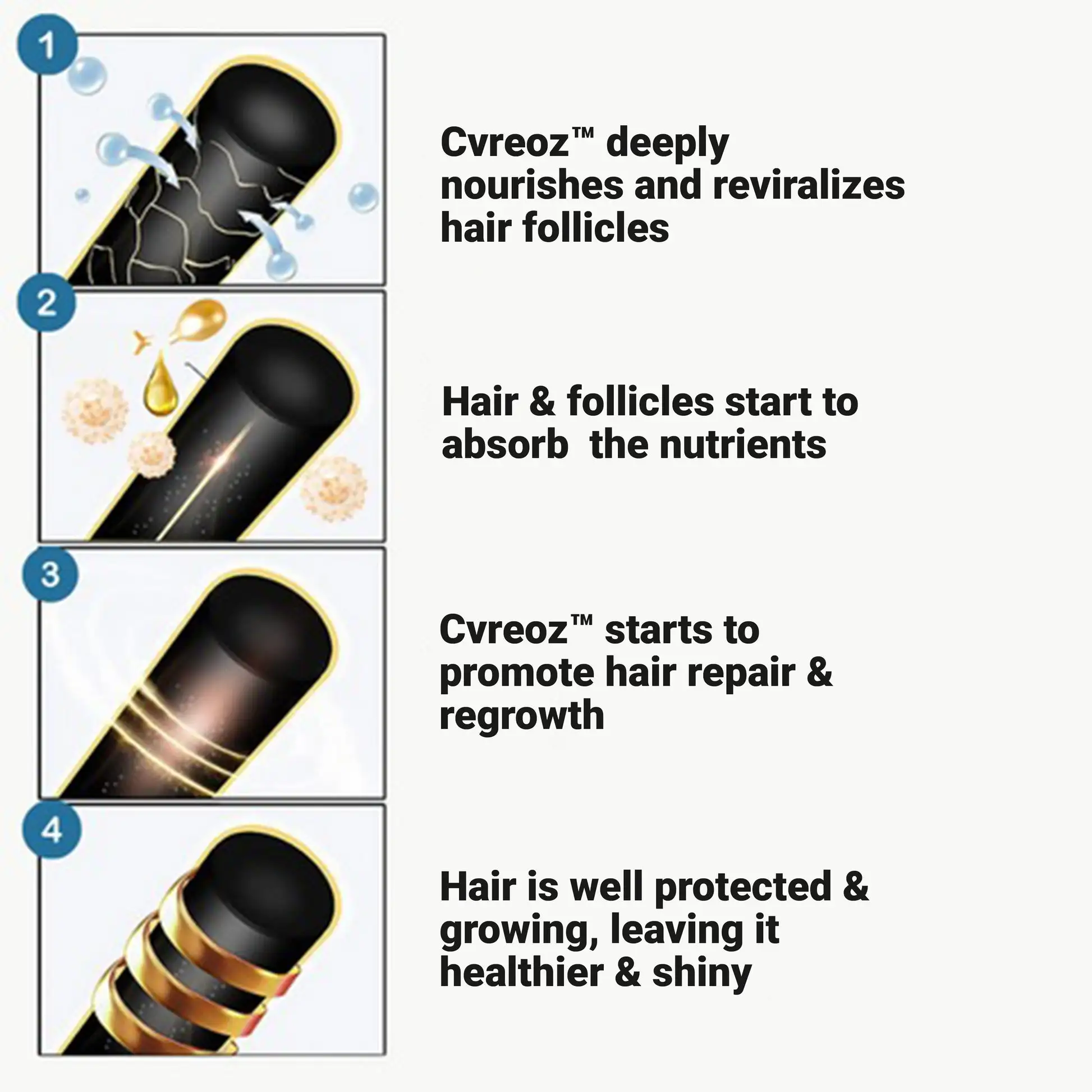 - Awakens Dormant Follicles: Cvreoz™ stimulates dormant hair follicles, encouraging them to enter the growth phase and produce stronger, healthier hair.