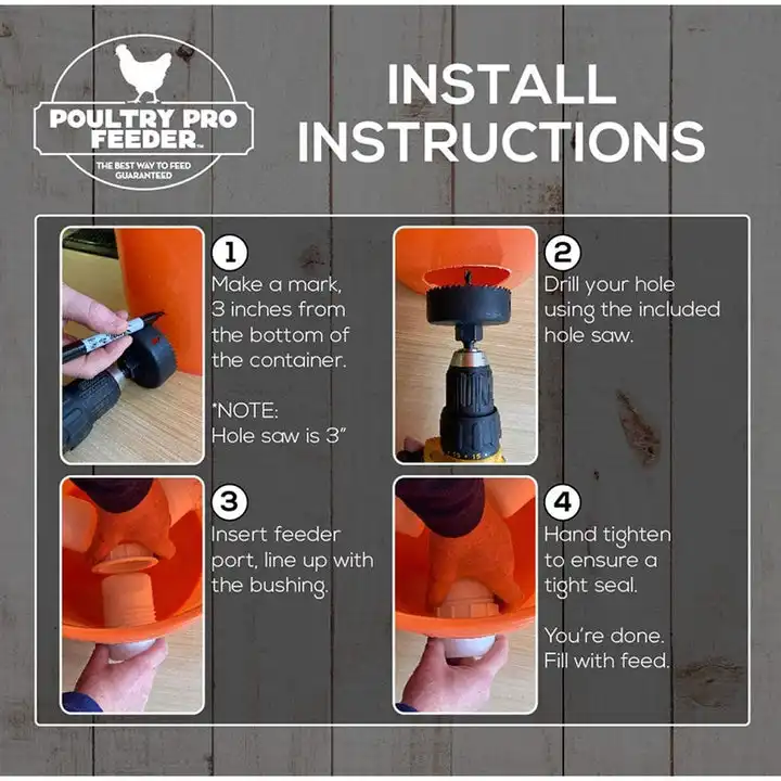 Super easy to put together and feed did not spill out. I ordered a set of 4 with the saw and a set of 4 without the saw placed 8 in a 20 gallon garbage can and they fit perfectly. Placed holes 3 inches off bottom could go 2 inches if you want. Set on blocks for easy access and added a step up for smaller chickens. Chickens seem to go right to it and eat without any spillage, only time will tell. I do have a few messy eaters so there will probably be some mess but so far so good much better than previous feeder I was using.