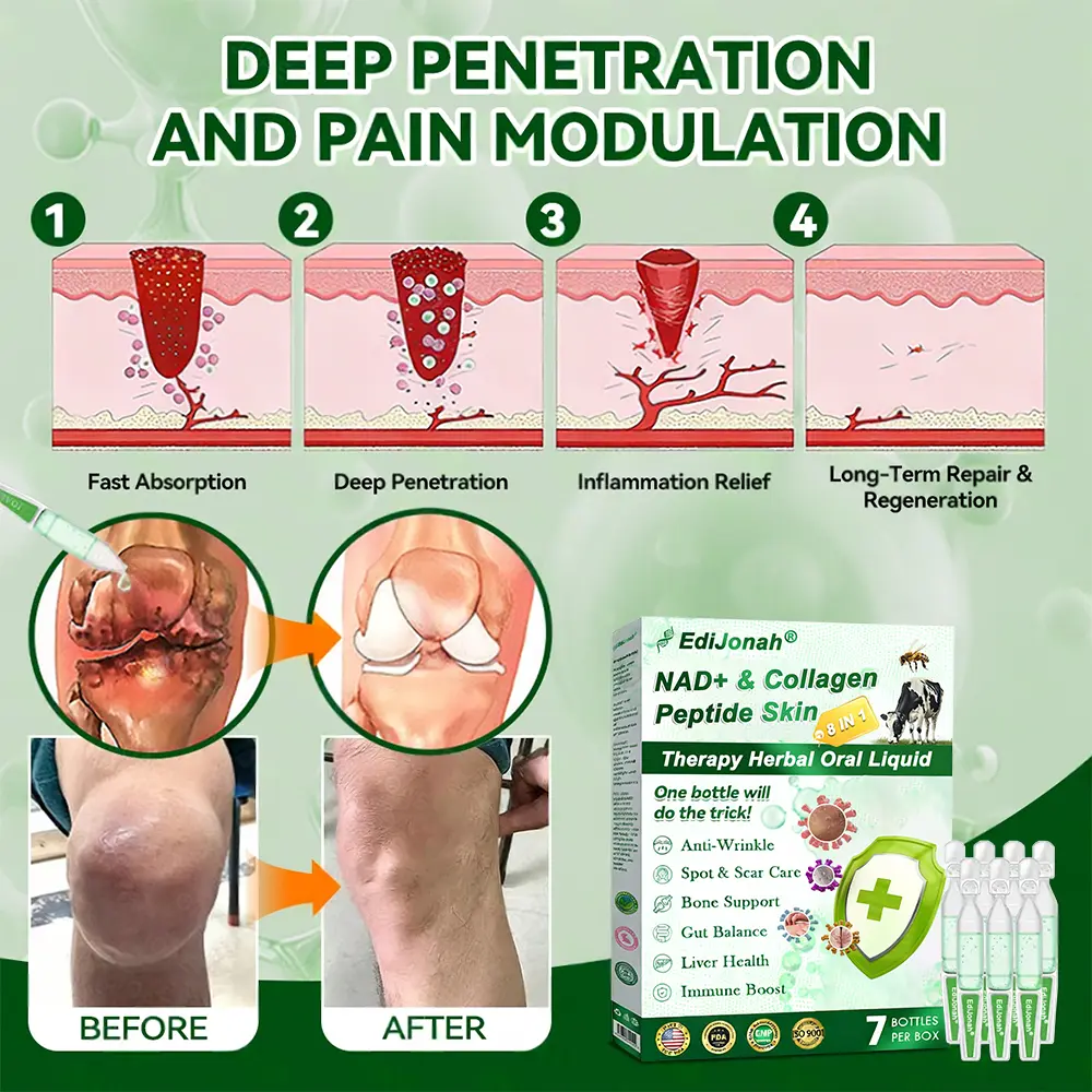 Clinically Proven: EdiJonah® NAD+ & Collagen Peptide Skin Therapy 8-in-1 Herbal Oral LiquidLiquid delivers visible results in just 7 days—firmer, brighter skin, smoother fine lines, and fading dark spots. With just one daily dose, it works from the inside out to rebuild collagen, reactivate cells, and restore a youthful skin barrier. At the same time, it boosts metabolism, supports detox and liver health, repairs joints, protects the brain, and elevates overall vitality—helping you reclaim your youth, health, and confidence from within.