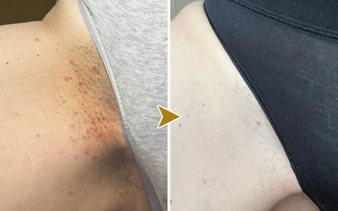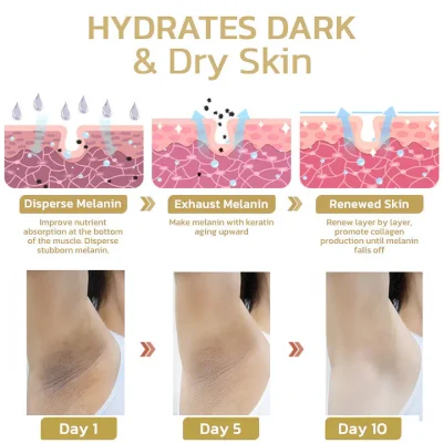 - Apply the serum: Take an appropriate amount of essence and apply it to darkened areas such as elbows, bikini line, back of hands, neck, underarms, and knees. Gently massage it in.