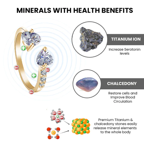 Typical magnetic products either use magnets with minimal magnetic field penetration or cause poles to repel, creating a dead zone between the magnets.Esmée Chalcedony Ionic Ring uses an Alternating North-South Polarity Orientation to maximize the magnetic field flow also release the electromagnetic charge to offer for remove blockages around the body and restore a natural flow of energy.