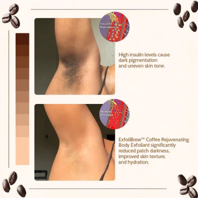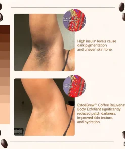 ExfoliBrew™ Coffee Rejuvenating Body Exfoliant is a uniquely crafted formula created to tackle the appearance of acanthosis nigricans, a skin issue marked by dark, thick patches. The expertly designed blend combines the power of Arabica coffee and lactic acid to gently cleanse and exfoliate the skin while encouraging a more even skin tone.