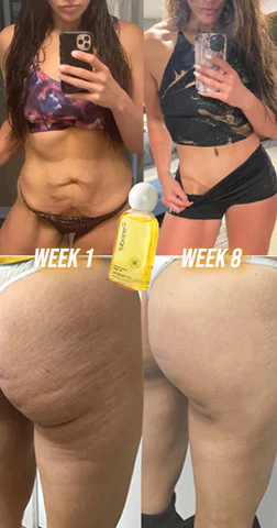 I am a twin mom and for all of us mothers out there let’s be honest our skin elasticity is never the same after bearing kids. I began using this product because I was searching for a skin tightening regimen and I stumbled across this item so I figured I’d try it out and the reviews were good. I ordered it and it arrived in 3 Days! On day 1 of using this product I took a picture. Exactly 1 week later after using this product once a day I took another picture. I have to say I am thoroughly impressed with how it actually works. The top photo is day 1 and the bottom photo is 1 week of using once a day. I was very skeptical at first but seeing the difference in these photos is proof that it does wonders. I would definitely recommend this product!