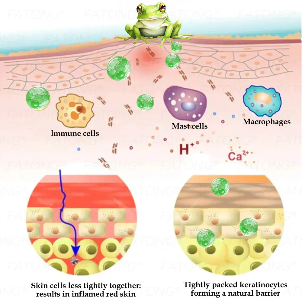 Frog Mucus Extract: A natural secretion rich in proteins, peptides, and bioactive enzymes. Scientific studies have revealed its remarkable therapeutic potential in skin repair and protection. It has shown benefits in promoting wound healing, reducing inflammation, improving skin barrier function, and supporting the treatment of skin conditions such as eczema, psoriasis, acne, and scars.