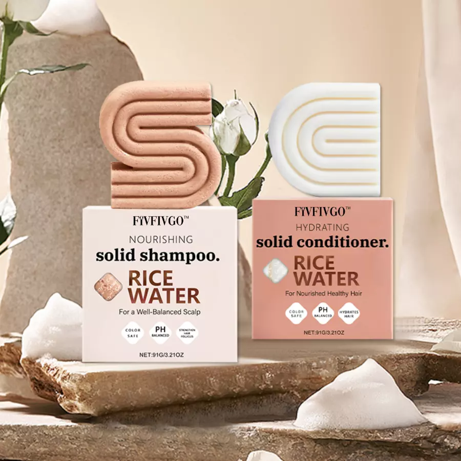 The Fivfivgo™ Rice Water Hair Growth Shampoo & Conditioner Combo is made with premium soap-based ingredients, eliminating the need for plastic bottles. This eco-conscious, sustainable choice helps reduce single-use plastic waste while offering a biodegradable, natural alternative for your hair care routine. By opting for our solid shampoo and conditioner set, you’re making an intentional choice to care for your hair and the planet.