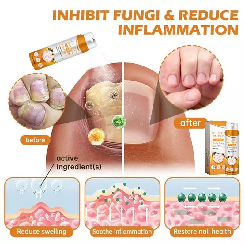 For individuals suffering from toenail psoriasis, the FLYCARE™ Bee Venom Psoriasis Relief Spray also contains antifungal properties that help reduce fungal growth, a common issue in psoriatic nails. This action helps improve nail health and appearance while relieving the discomfort of toenail psoriasis.