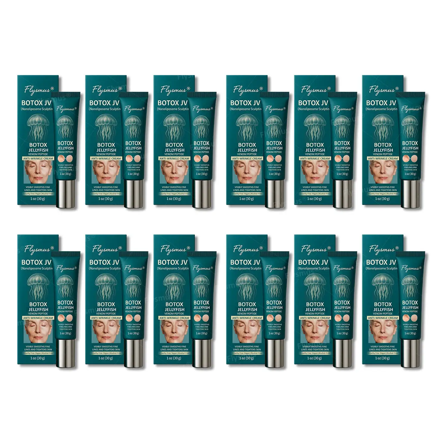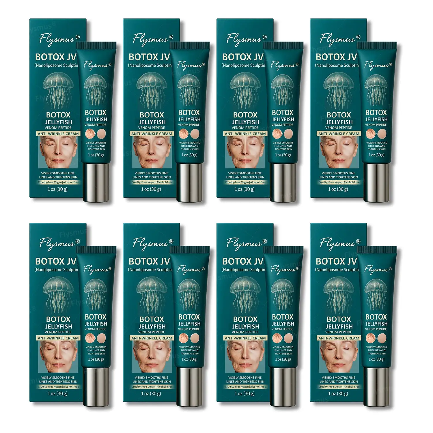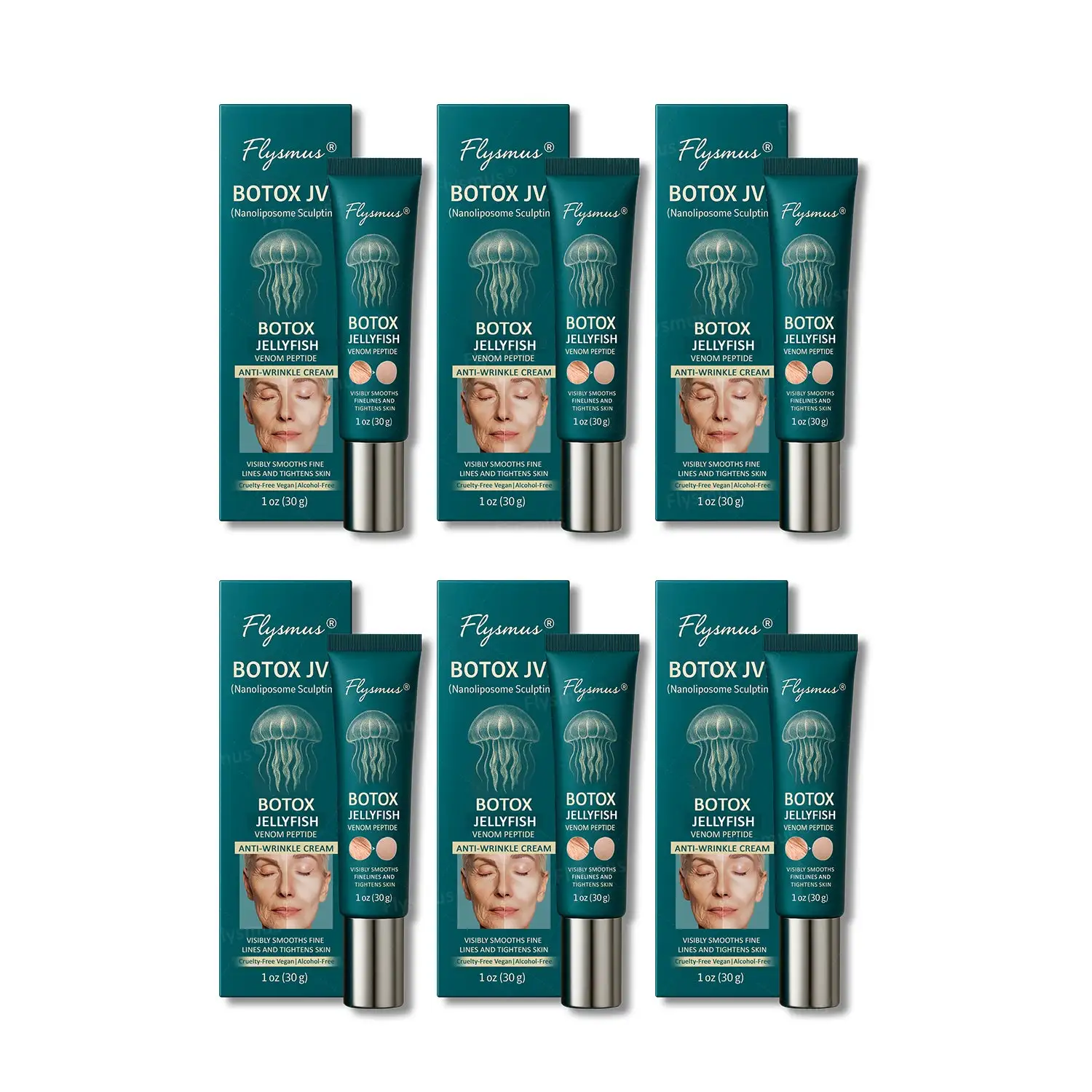 Flysmus® Botox Jellyfish Venom Peptide Nanoliposome Sculpting Anti-Wrinkle Cream combines the dual anti-aging ingredients of Botox and Jellyfish Venom Peptides, along with innovative nanoliposome delivery technology, to deeply penetrate the skin and quickly smooth fine lines and wrinkles. It instantly activates skin elasticity, reshapes a firm contour, and effectively improves skin sagging, fine lines, and signs of aging over time. Suitable for all skin types, including sensitive skin, it has undergone rigorous dermatological safety testing to ensure it is gentle and non-irritating. Let your skin glow with youthful radiance, regain fullness and firmness, and effortlessly reverse the signs of aging.