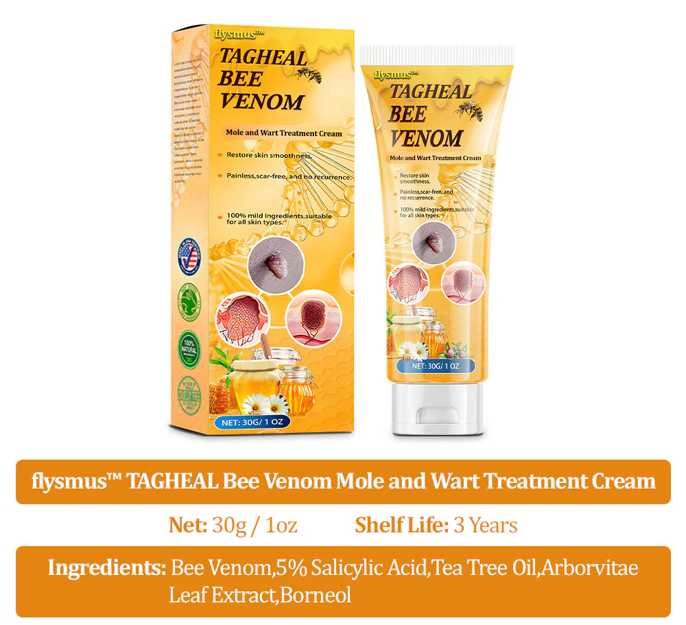 flysmus™Tagheal Bee Venom Mole and Wart Treatment Cream offers a solution by leveraging the powerful attributes of bee venom to specifically address diverse skin irregularities like skin tags, moles, warts, and blemishes. Enriched with active components derived from bee venom, this advanced formulation works to dissolve and delicately eliminate undesirable growths.