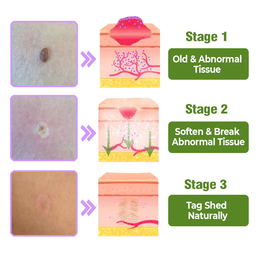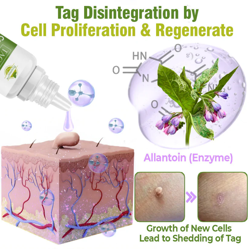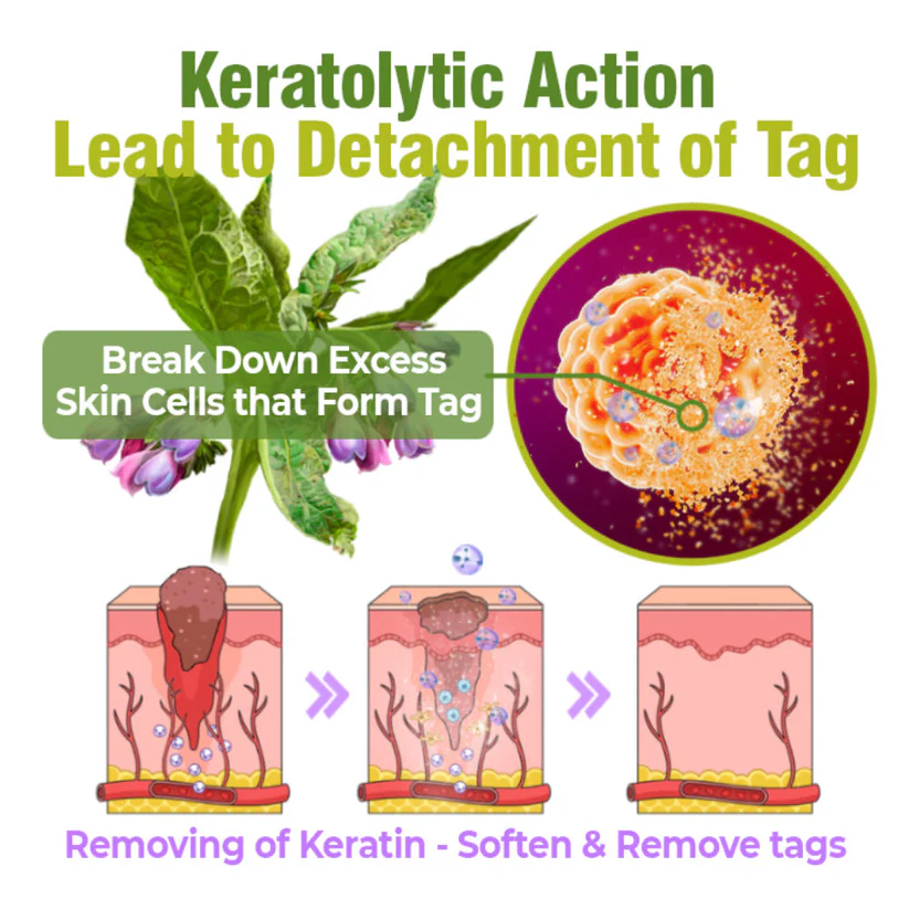 The TagOff Treatment Serum utilizes the healing power of comfrey, to effectively and gently remove skin tags. Central to this process is the enzyme allantoin, found in comfrey, which is scientifically proven to promotes the growth of new, healthy skin cells around the tag while simultaneously encouraging the shedding of old, dead skin cells. This dual action leads to the gradual and natural disintegration of the skin tag as fresh cells replace the older, damaged ones.