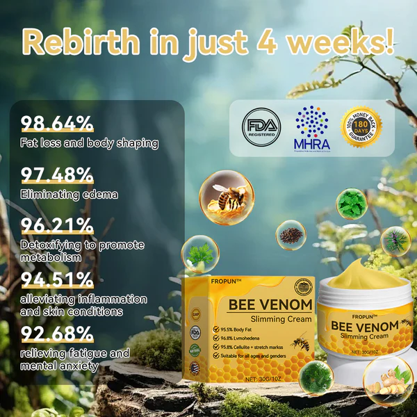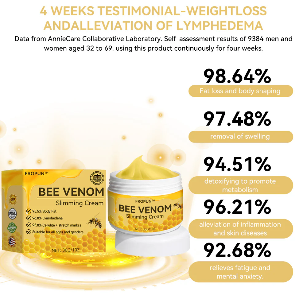 Simply apply on the Fropun™ Bee Venom Slimming Cream, and the next morning when you wake up, you’ll be pleasantly surprised to find that your weight has decreased, and your body feels lighter, effortlessly reaching your weight loss goals.