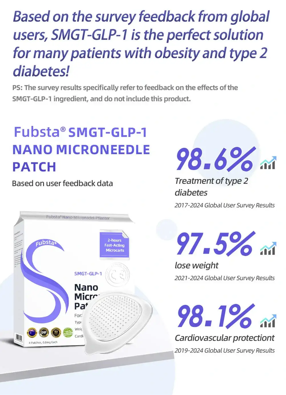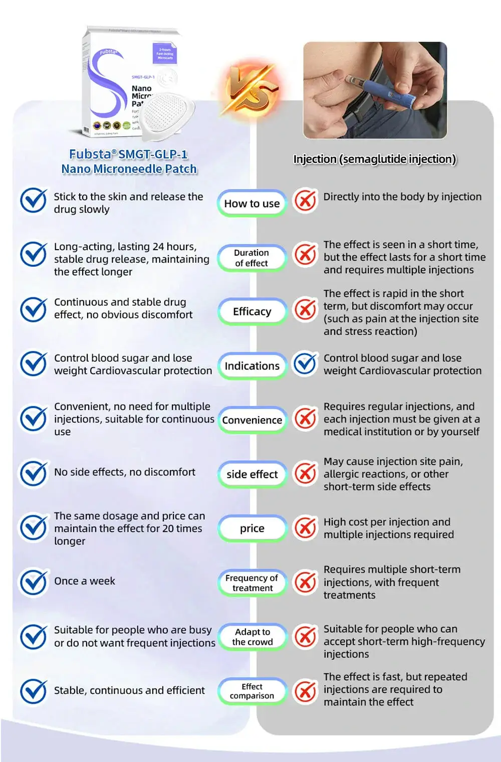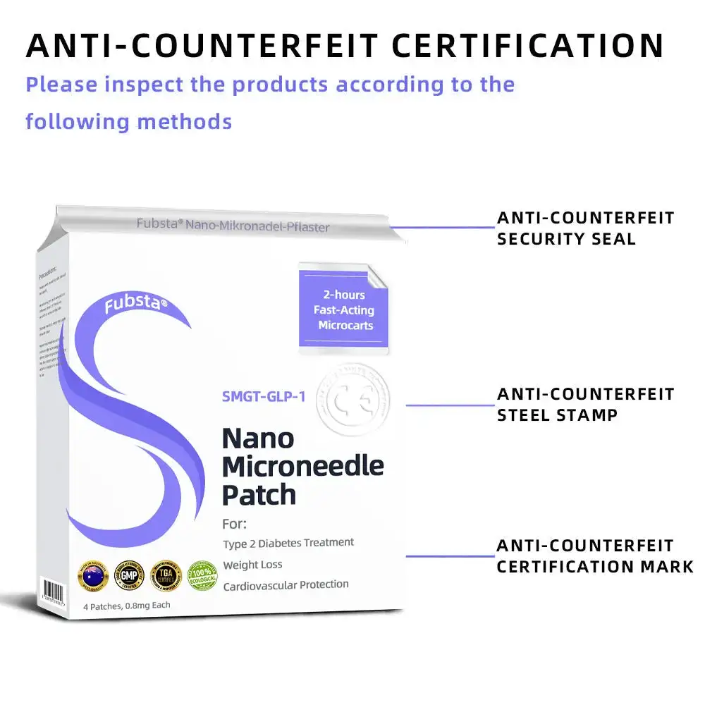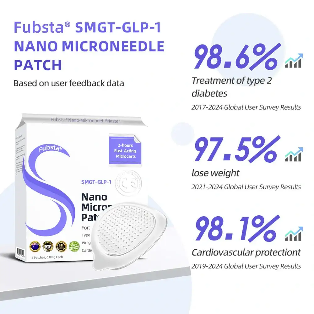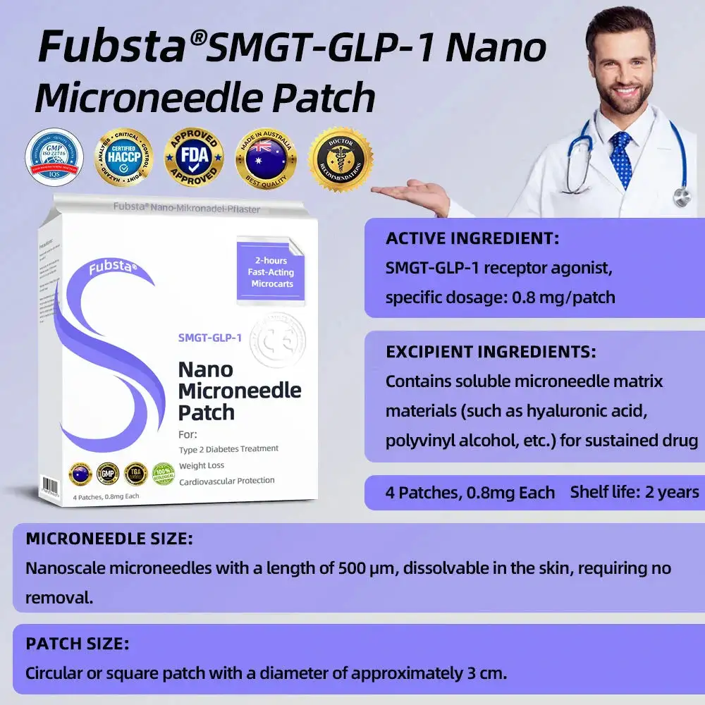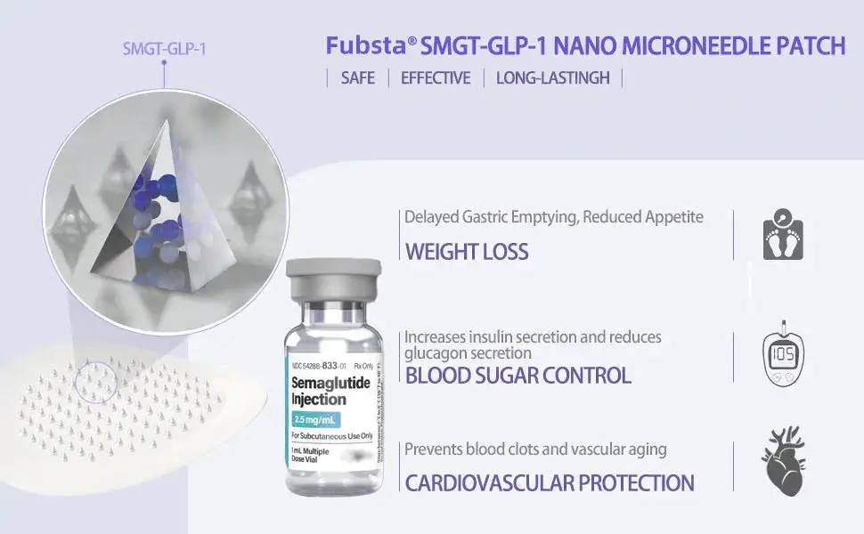 The Fubsta™ SMGT-GLP-1 Nano Microneedle Patch offers a long-lasting. slow release of the medication. ensuring a stable effect over 24 hours without causing any discomfort. With the same dosage and price. it can maintain up to 20 times longer-lasting effects (similar to the difference between an IV drip and a single injection).