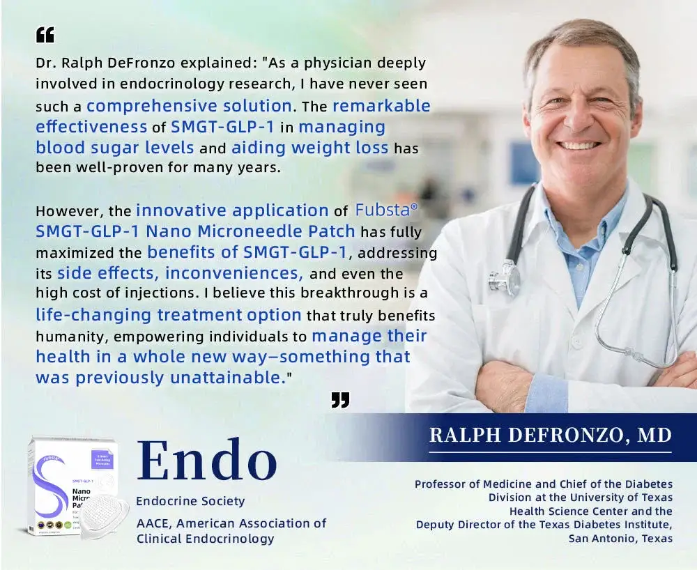 “I suffer from both obesity and diabetes. and I’ve been getting SMGT-GLP-1 treatment at the hospital. You might be wondering why I suddenly switched to using the Fubsta™ Microneedle Patch. SMGT-GLP-1. also known as semaglutide. is definitely a great treatment. It works really fast—just a short time after injection. my appetite dropped. I lost weight quickly. and my blood sugar went down. But. as we all know. it’s tough to break old habits. On my scheduled injection days. I’d come up with all sorts of excuses to skip. which led to failed treatments. The cost. hunger. time conflicts. or even something as simple as it raining outside would keep me from going. But the Microneedle Patch is perfect for someone like me who struggles with inertia. I can use it easily at home. and the effects last. keeping my appetite in check. What’s even better is that it’s really affordable. and anyone can use SMGT-GLP-1 to help lose weight and keep their blood sugar in check!”