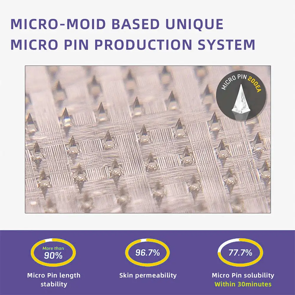 Each needle is 0.27mm long. just 1/7th the thickness of a hair. and is made from dissolvable medication. These micro-needles are precision-engineered using cutting-edge manufacturing techniques to ensure a seamless. pain-free experience while effectively delivering the active ingredients directly into the skin.