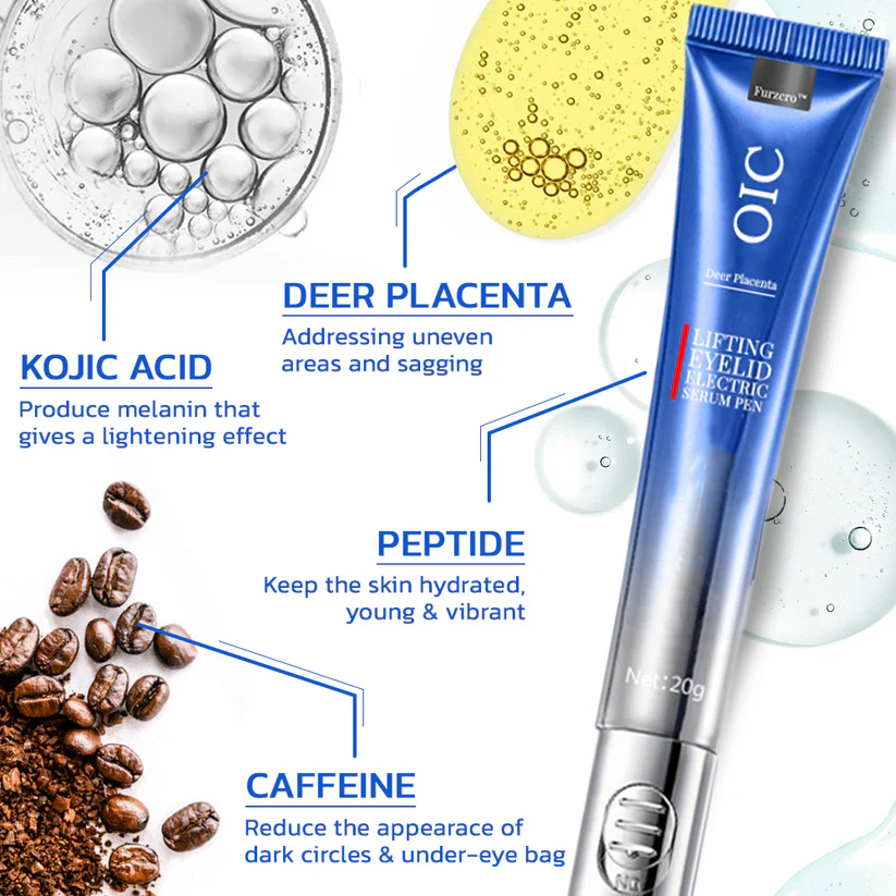 The Furzero™ OIC Deer Placenta Lifting Eyelid Electric Serum Pen is the ideal solution for aging skin. It targets signs of aging and instantly brightens tired eyes, reducing fine lines. High frequency micro-vibration technology from the device can aid in firming eyelids muscle and enhancing the absorption of serums. Combining deer placenta, kojic acid, and caffeine, it effectively addresses entropion, sagging, and puffiness within just 14 days, tackling all aging eye skin concerns.