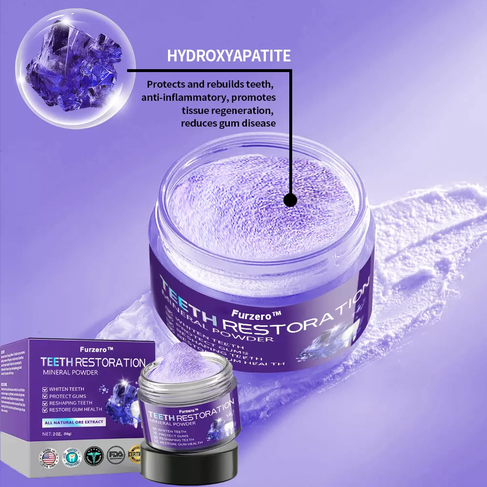 Furzero™ Teeth Restoration Mineral Powder is a revolutionary dental care solution designed to enhance your oral health. Packed with natural ingredients like hydroxyapatite, coenzyme Q10, and activated charcoal, this mineral powder effectively tackles a variety of dental concerns, from gum inflammation and plaque removal to cavity prevention and tooth enamel restoration.