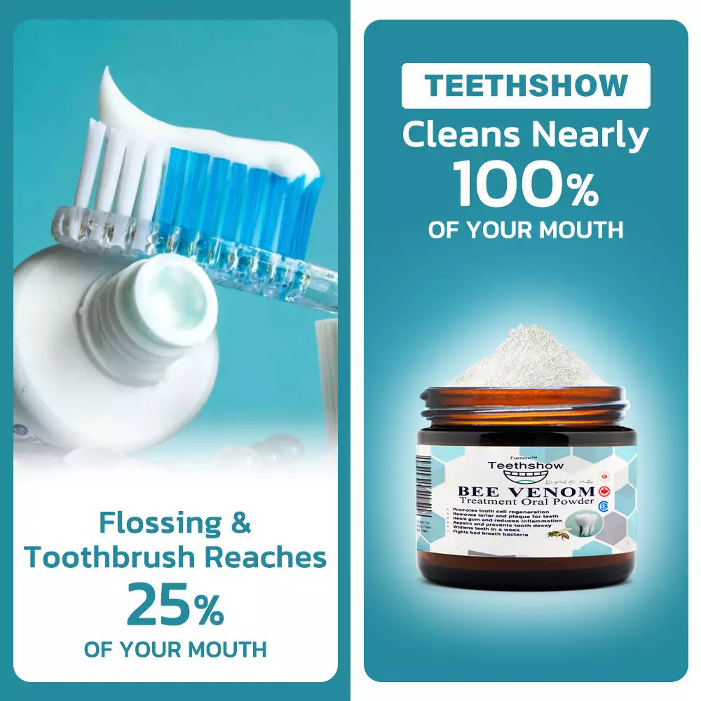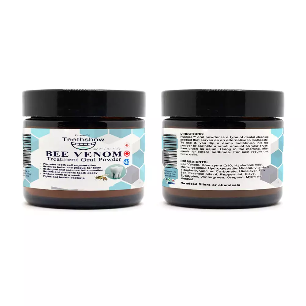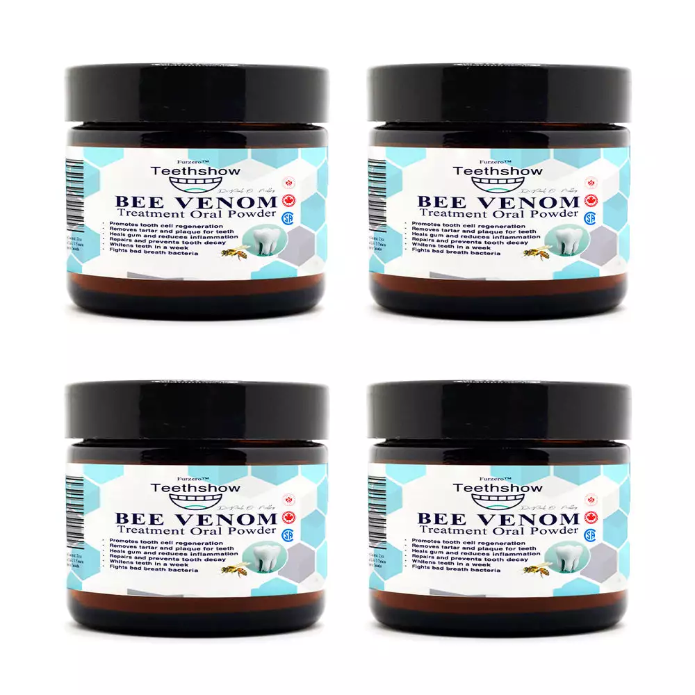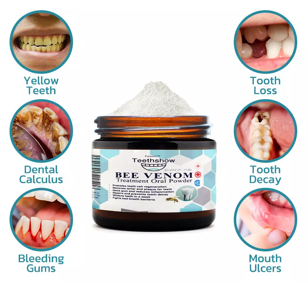 The Furzero™ Teethshow Bee Venom Treatment Oral Powder is marketed as a groundbreaking oral care product designed to address a wide range of dental issues, such as plaque, tartar, gingivitis, cavities, toothaches, and gum inflammation, while also promoting tooth regeneration and whitening. It combines the potent natural properties of bee venom with other herbal ingredients to offer an all-in-one solution for improved oral health.