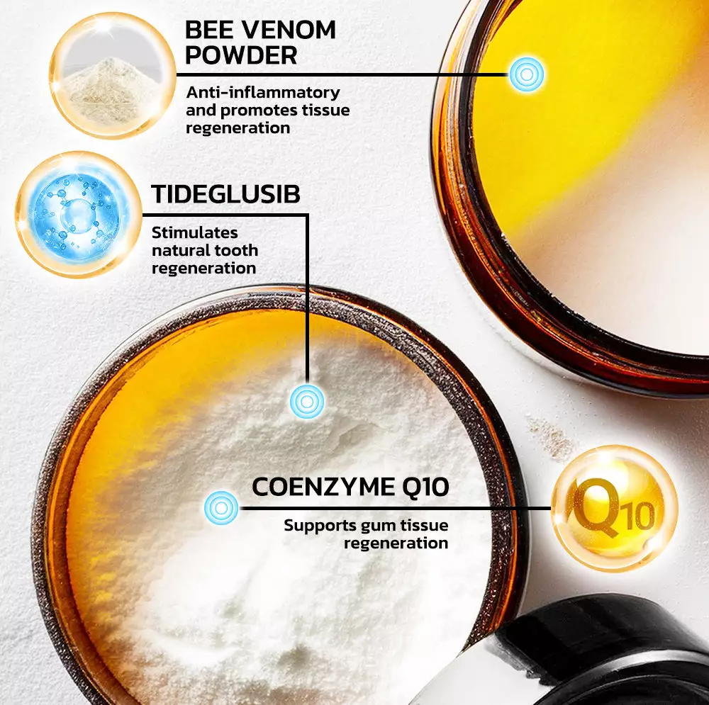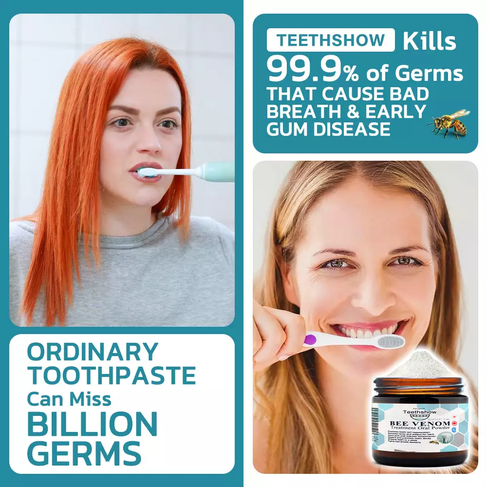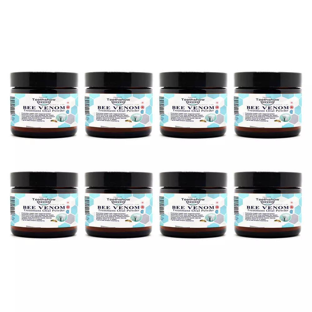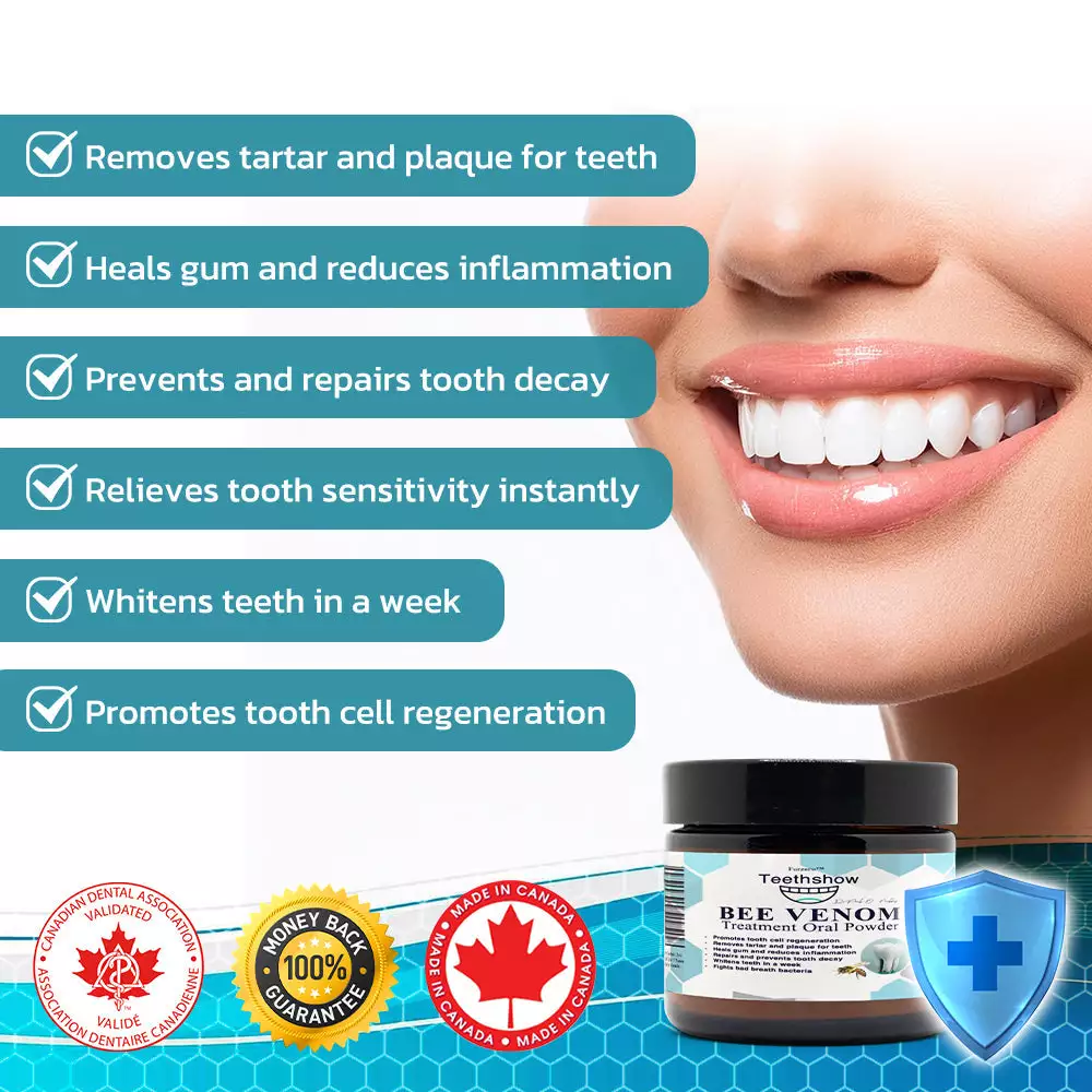 The Furzero™ Teethshow Bee Venom Treatment Oral Powder is marketed as a groundbreaking oral care product designed to address a wide range of dental issues, such as plaque, tartar, gingivitis, cavities, toothaches, and gum inflammation, while also promoting tooth regeneration and whitening. It combines the potent natural properties of bee venom with other herbal ingredients to offer an all-in-one solution for improved oral health.