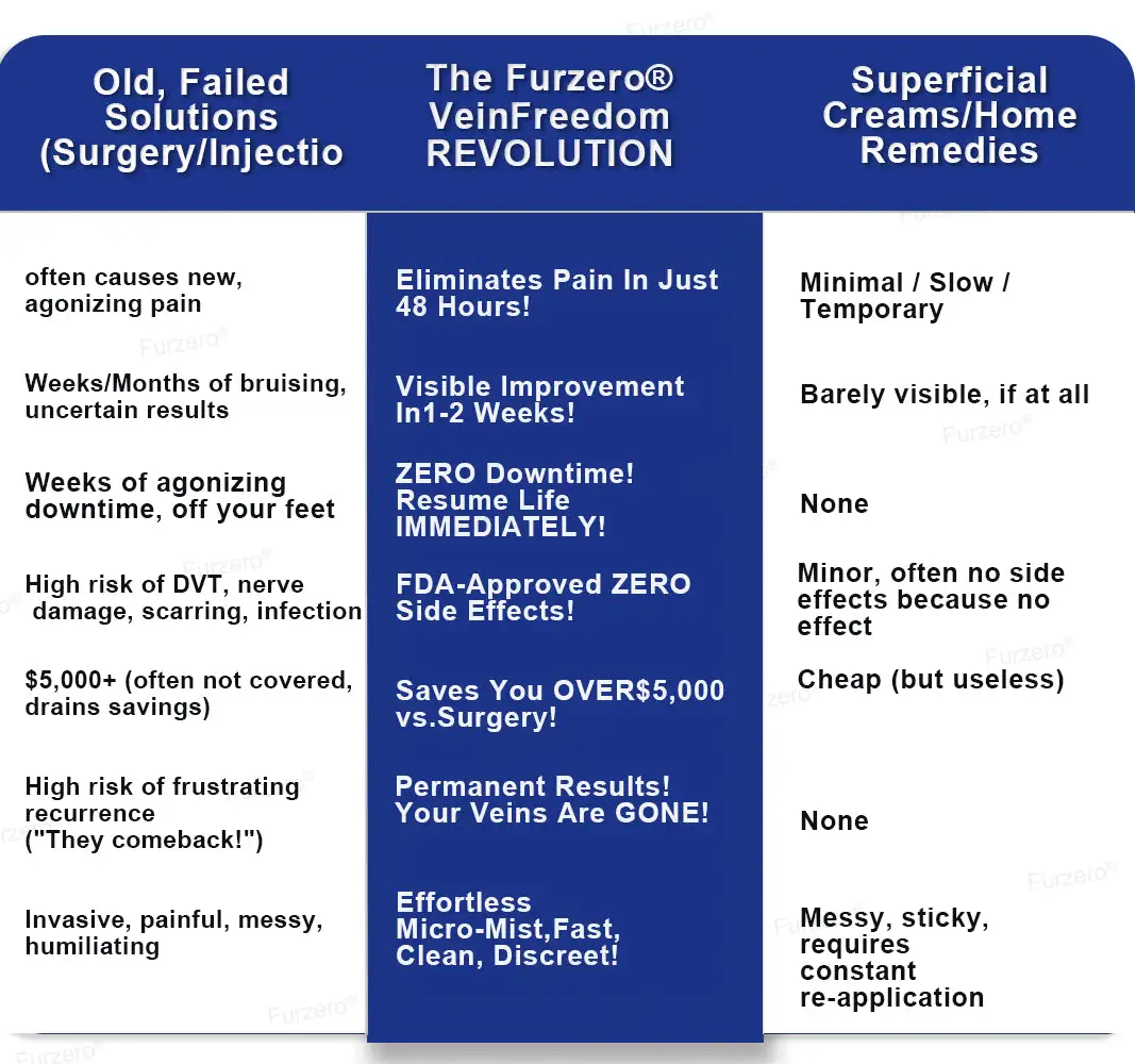 We know you’ve been burned by false promises and ineffective treatments. That’s why we’re confident to show you, side-by-side, why Furzero® VeinFreedom is the definitive solution, designed to meet the exact needs and frustrations we’ve heard from thousands of sufferers like you: