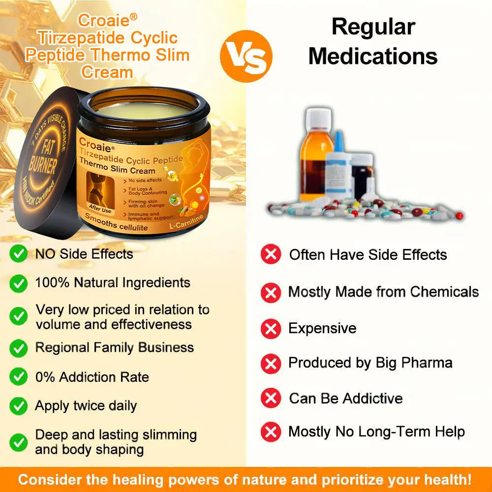 Croaie®NIDDK Tirzepatide Cyclic Peptide Thermo Slim Cream is a breakthrough formula developed by a team of over 30 metabolic health experts at the Mayo Clinic, based on more than 20 years of clinical research. This innovative cream combines NIDDK-Tirzepatide, medical-grade botulinum toxin, and powerful herbal extracts. The heat generated through skin absorption activates NIDDK-Tirzepatide to promote insulin secretion and inhibit glucagon secretion, thereby helping to regulate blood sugar levels and support weight loss. It also aids the digestive system and helps smooth out cellulite.