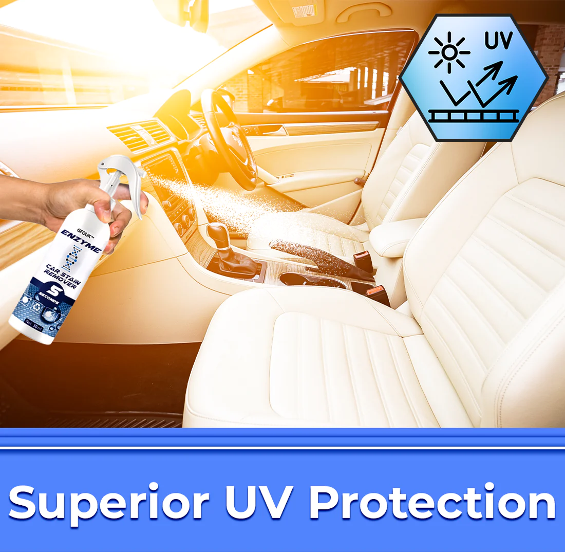 Eliminate stubborn stains and recover the original color and shine of your car with ease in 5 SECONDS. Enjoy a car that looks as though it’s brand NEW. Provides a lasting 5 year protection with a non-greasy finish. Simply spray onto the stained area and wipe gently. No further rinsing is necessary post-cleaning. Enzyme shields against fading, discoloration and cracking caused by damaging UV rays, offering up to 6 months of protection.