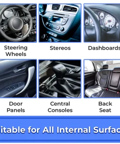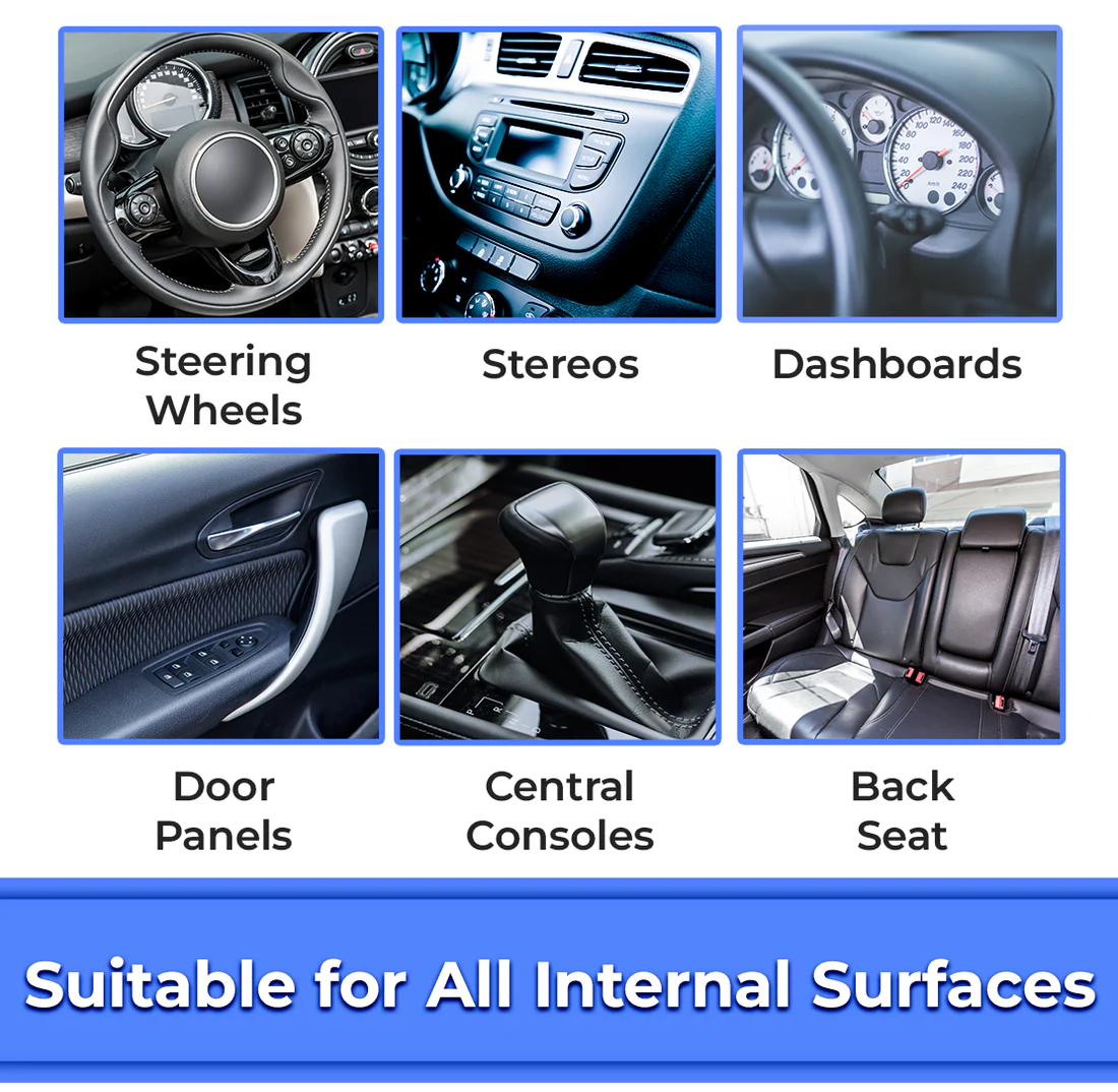 Eliminates deeply embedded dirt to generating a non-greasy, matte, and odor-free coating that remains for up to 6 months. Contains 0% silicone oils or petroleum distillates preventing greasy buildup. It is safe to use on all interior surfaces, such as steering wheels, stereos, dashboards, door panels and central consoles.