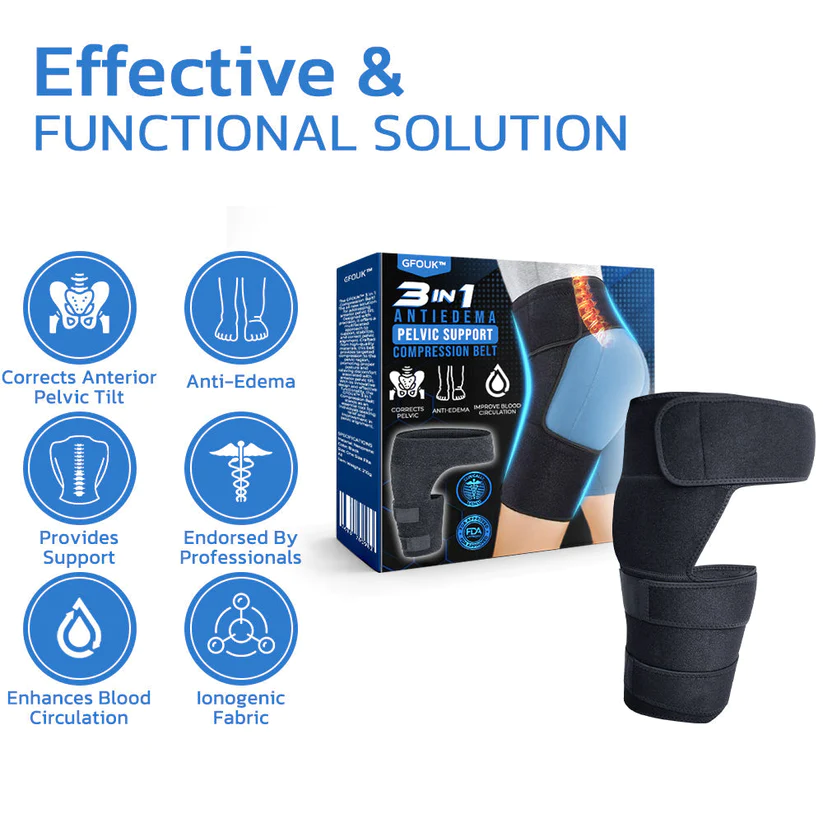 Introducing the GFOUK™ 3 in 1 AntiEdema Pelvic Support & Compression Belt! The all new solution for addressing anterior pelvic tilt. Designed with precision, it offers a multifaceted approach to support, stabilize, and correct pelvic alignment. Crafted from high-quality materials, this belt provides targeted compression to the pelvic region, promoting proper posture and relieving discomfort associated with anterior pelvic tilt. With its innovative design and effective functionality, the GFOUK™ 3 in 1 AntiEdema Pelvic Support & Compression Belt stands as an essential tool for individuals seeking relief and improvement in pelvic alignment.