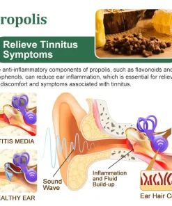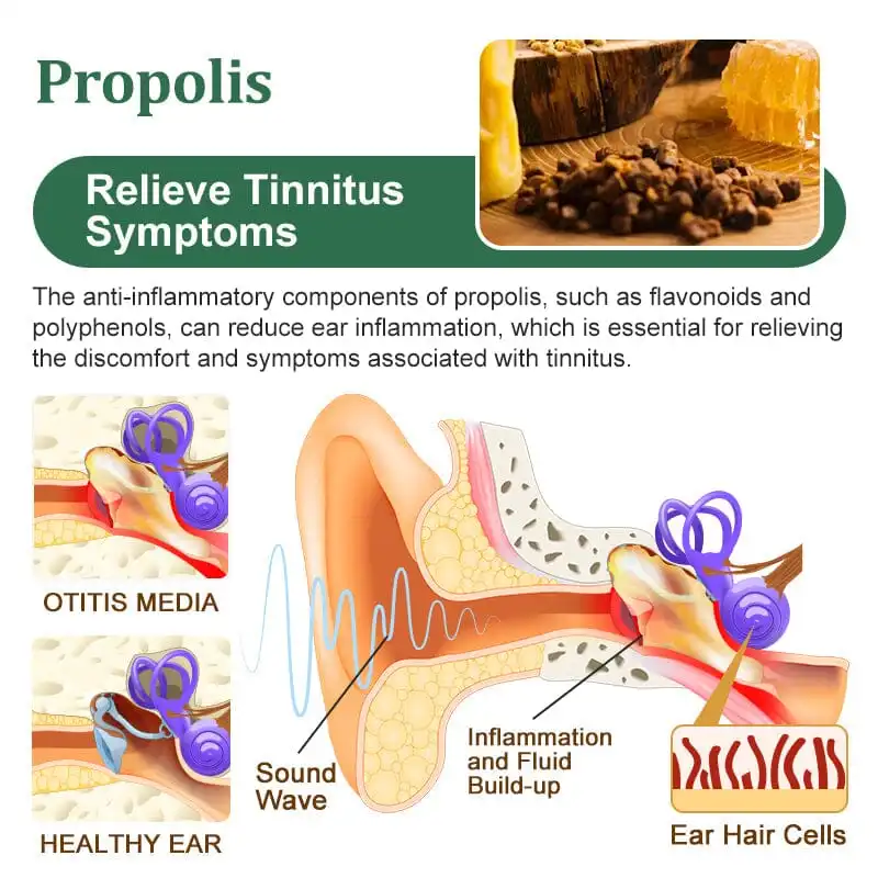 The propolis component of this spray is great for relieving tinnitus and removing ear wax. The results are quick and I like that it is a spray that actually reaches the ear canal. The instructions say not to use it on patients who are allergic to honey.