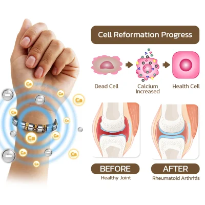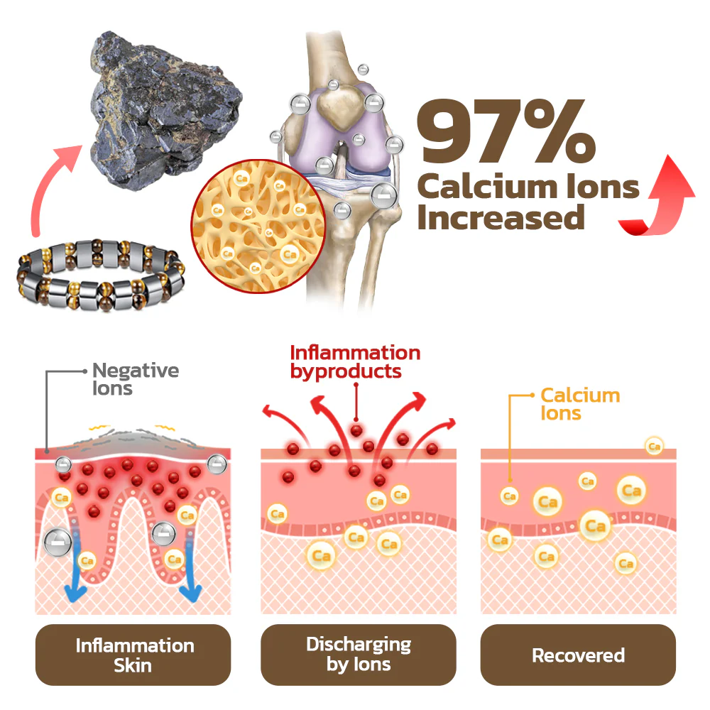 Introducing our GFOUK™ IoniCalci Arthritis Bracelet, harnessing negative ions to aid joint health. Negative ions facilitate the movement of substances in and out of synovial cells, aiding in the elimination of inflammation byproducts. Also, negative ions can products calcium ions. The infusion of calcium ions supports cell reformation, enhancing joint mobility. Experience the transformative benefits for arthritis with our innovative bracelet, enjoying a pain-free and active lifestyle.