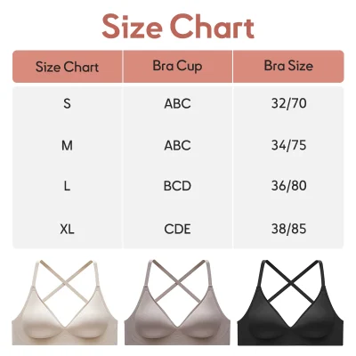 | Size | S – 32/70ABC, M – 34/75ABC, L – 36/80BCD, XL – 38/85CDE |