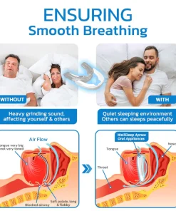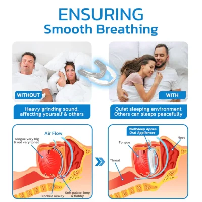 The innovative design of a double-line belt in products like the GFOUK™ WellSleep Apnea Oral Appliances ensures that the tongue remains in a neutral position during sleep, preventing it from curling and facilitating smoother breathing. This feature not only helps to avoid teeth grinding but also contributes to a more comfortable and uninterrupted night’s sleep. The physical prevention of tongue movement enhances the overall sleep experience, making these products a valuable solution for those seeking improved oral health and quality rest.