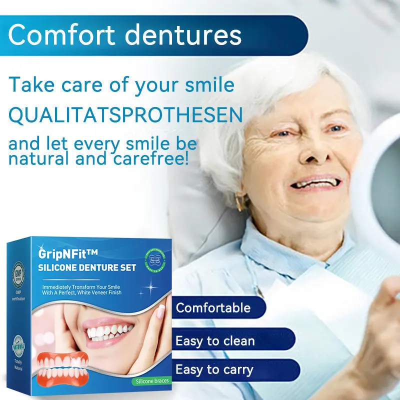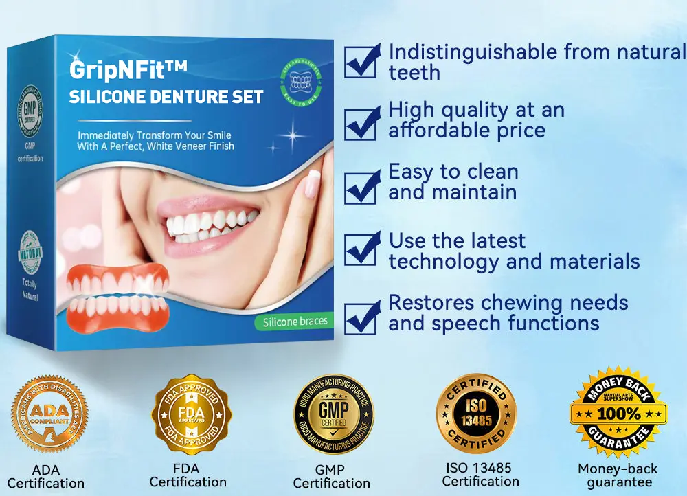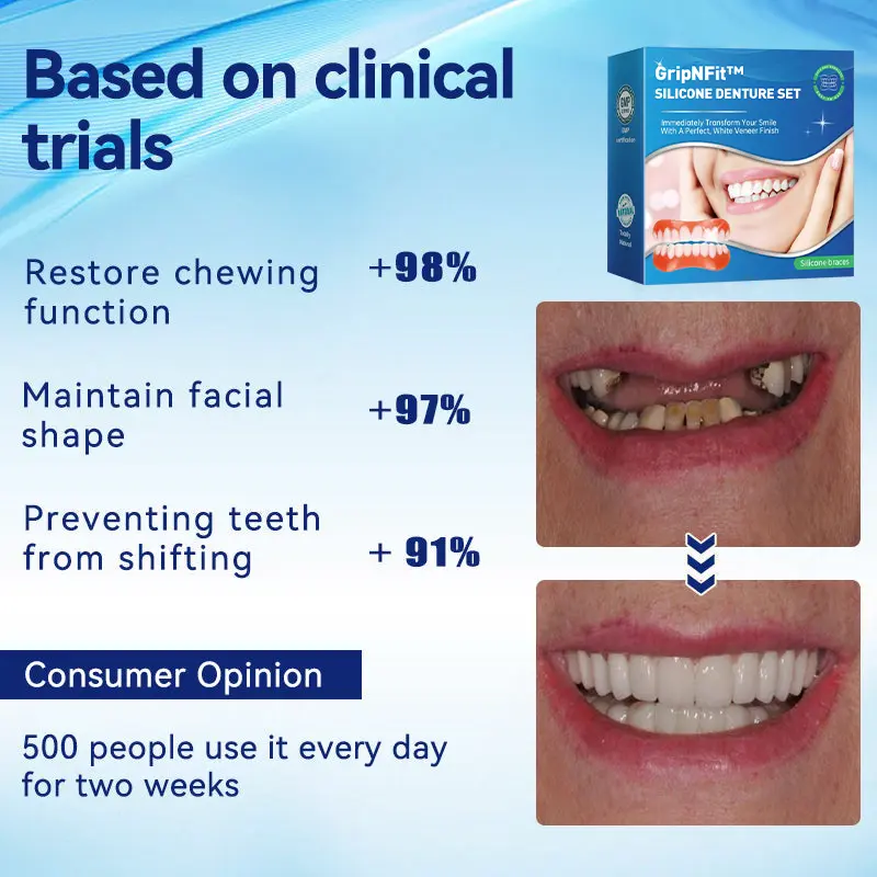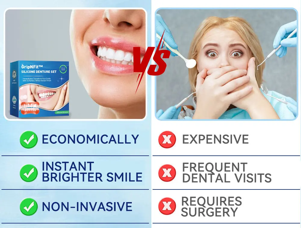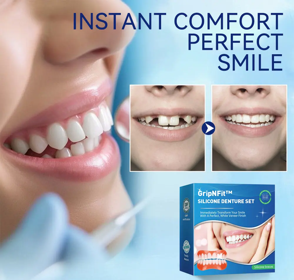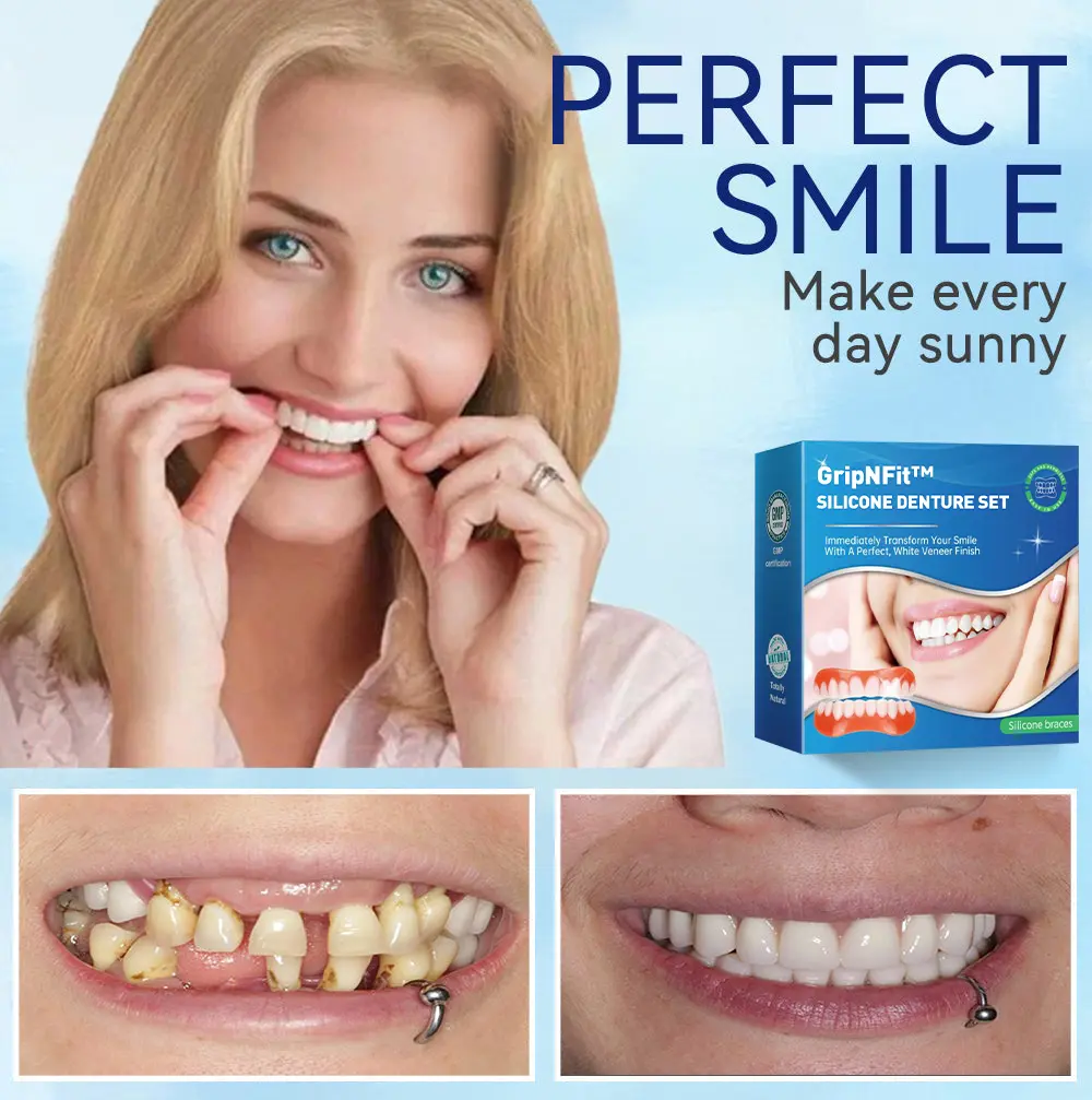 Do you sometimes feel insecure about your smile or crooked teeth? There’s no need to go to the dentist for expensive treatment! The GripNFit™ Silicone Denture Set offers a cost-effective solution to achieve a perfect smile.