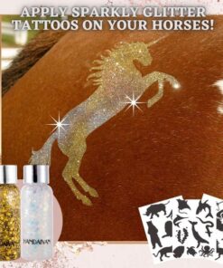 Apply Sparkly Glitter Tattoos On Your Horses! Craving for a unique and shiny equine? Complicated steps when designing your horse? Try this Glitter Tattoo Kit! Be your equine grooming designer with no effort required!