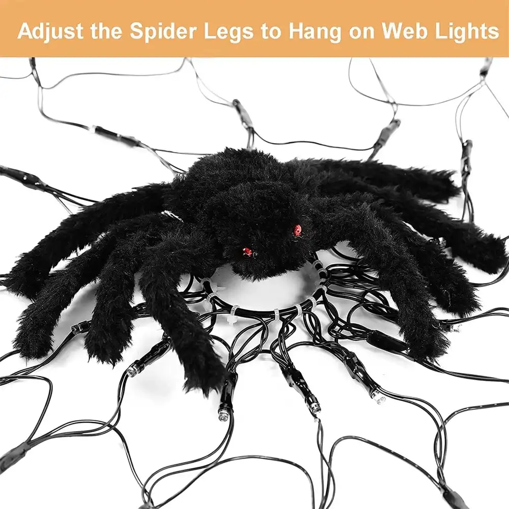 The hairy black spider with red eyes and stretchable legs looks very realistic, perfectly matched with the black spider web to decorate your home. Upgrade function: 8 different lighting modes, you can adjust the brightness and change the light effect according to the needs of the scene. Use LED Spider Web Lights to attract and surprise your neighbors on Halloween!