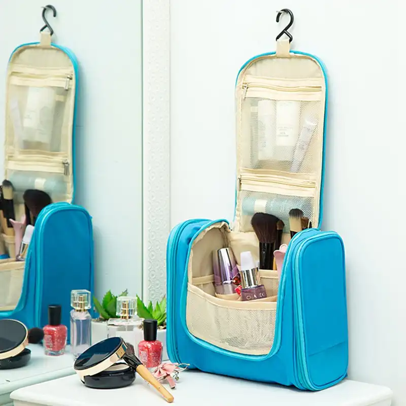 The toiletry bag provides a reliable loop handle for convenient carrying from a travel bag to the hotel bathroom, or to hang in a closet or doorknob when not in use. The hanging kit offers a wipeable surface that is resistant to steamy baths, general wear and tear from continued use.