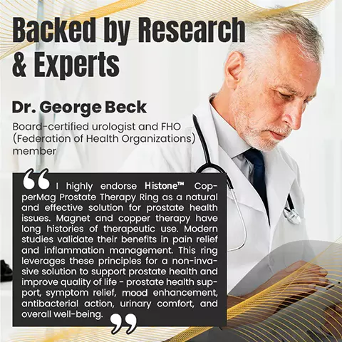 “I highly recommend the Histone™ Prostate Therapy Lava Ring for anyone dealing with prostate health issues. Its combination of magnet and copper therapy is proven to offer relief from pain, reduce inflammation, and improve urinary health. This non-invasive device is an excellent option for supporting prostate function and overall well-being.”