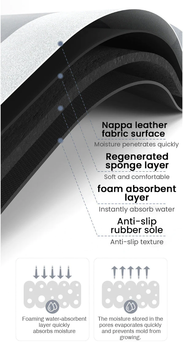Traditional bath mats collect and hold dirt and bacteria, and never fully dry out which causes them to smell and collect mildew. HOME™ MAGIC QUICK DRY MAT is built with Quick Dry Technology, The inclusion of antimicrobial Quaternary ammonium salts effectively kills bacteria, viruses, and fungi. which can help prevent any mold, mildew, or unpleasant odor.