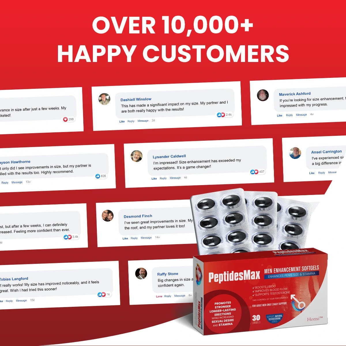 ”As an enthusiastic advocate for intimate relationships, I wholeheartedly recommend Honxi™ Peptidesmax Men Max Strength and Vitality Softgels to men seeking to enhance their partners’ intimate vitality. This unique formula is composed of a variety of carefully selected natural ingredients that harmoniously coexist, contributing to heightened passion and pleasure. As you embrace the newfound sensations of your inner beast, you’ll witness the miracle unfold. Honxi™ Peptidesmax Men Max Strength and Vitality Softgels addresses a range of factors that influence intimate experiences, offering a comprehensive approach to nurturing physical and emotional closeness. Its all-natural, safe ingredients are an invaluable treasure for your relationship.“
