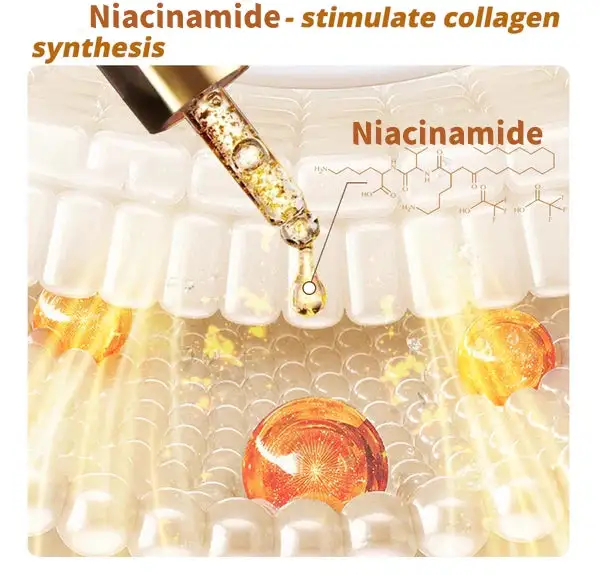 - Niacinamide: Stimulates collagen production, boosts skin elasticity, and improves skin texture while reducing wrinkles and fine lines.