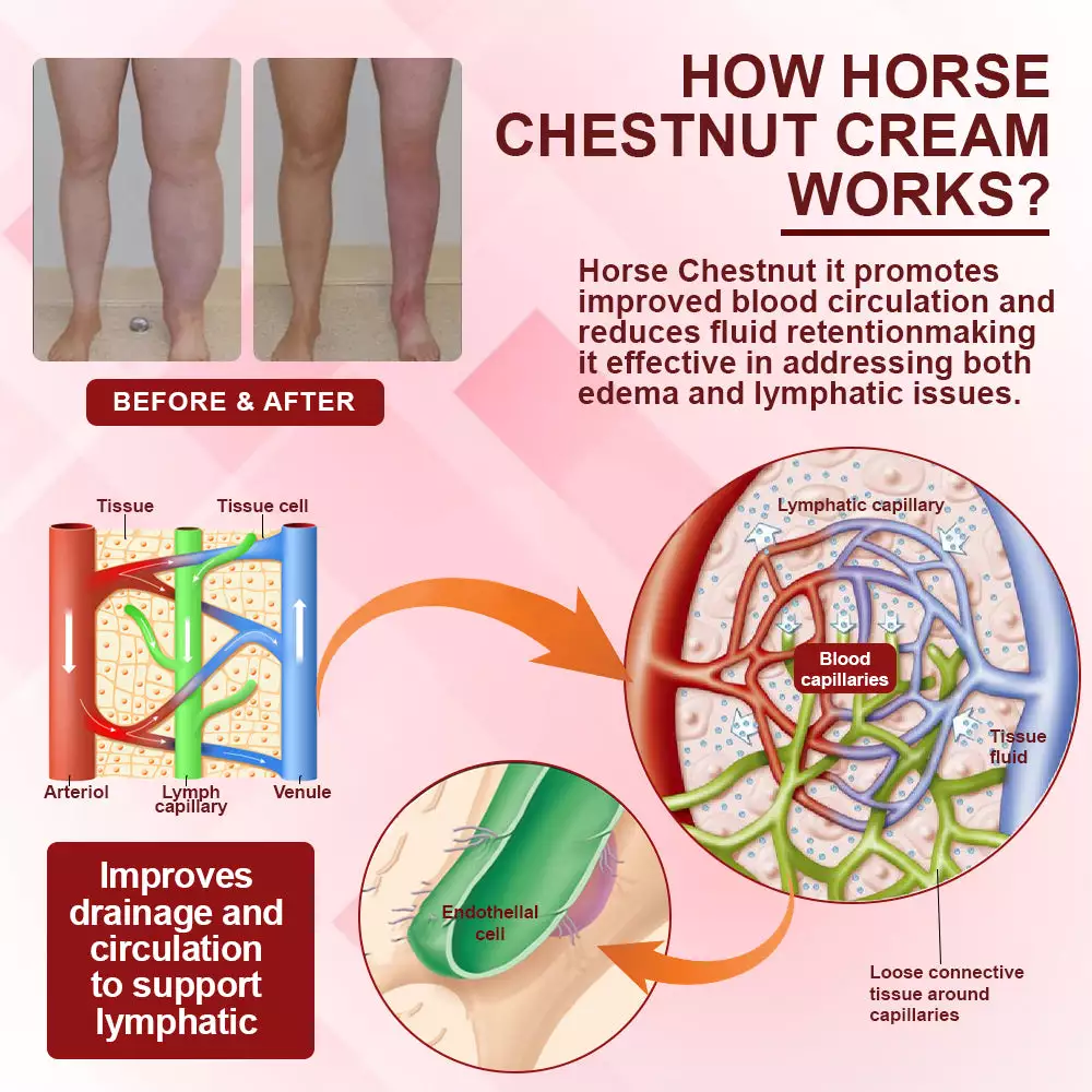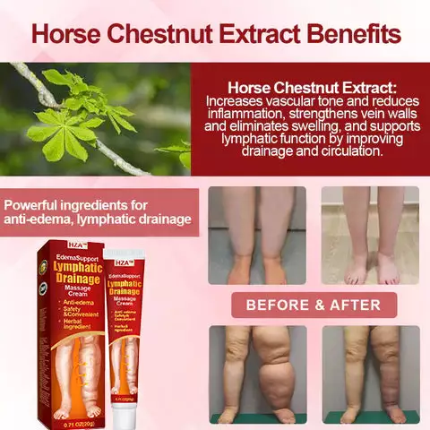HZA™ EdemaSupport Lymphatic Drainage Massage Cream leverages the powerful properties of Horse Chestnut Extract, a natural ingredient known for its effectiveness in combatting edema. This extract contains aescin, which enhances vascular tone, reduces inflammation, and strengthens vein walls to help diminish swelling. Additionally, flavonoids provide antioxidant protection to blood vessels, while tannins and sterols promote better lymphatic drainage and circulation.