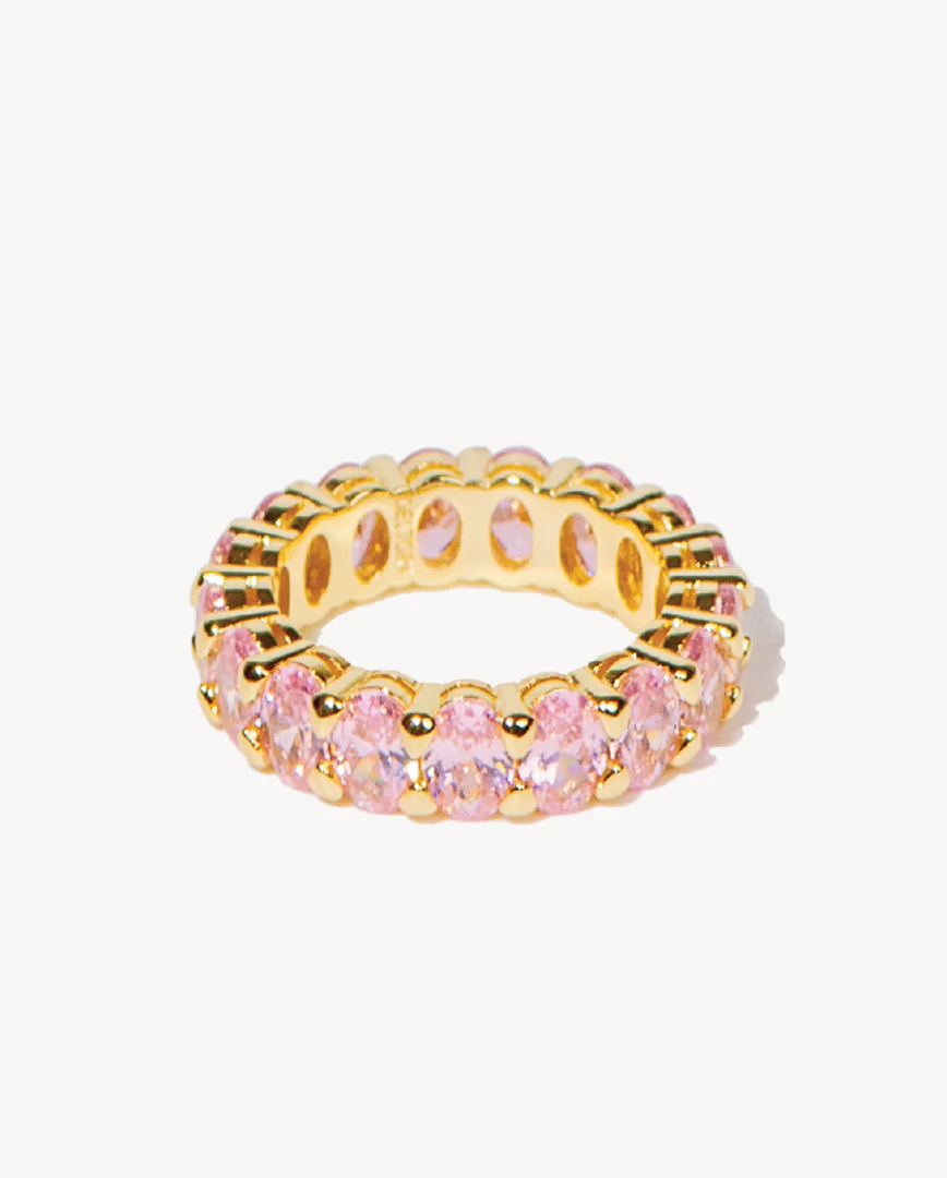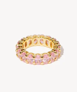 Hand-crafted in 14k gold plating, this pink eternity ring is inspired by timeless design. Featuring a band filled with glittering pink cubic zirconia. A piece fit for royalty, make heads turn in this eye-catching design.