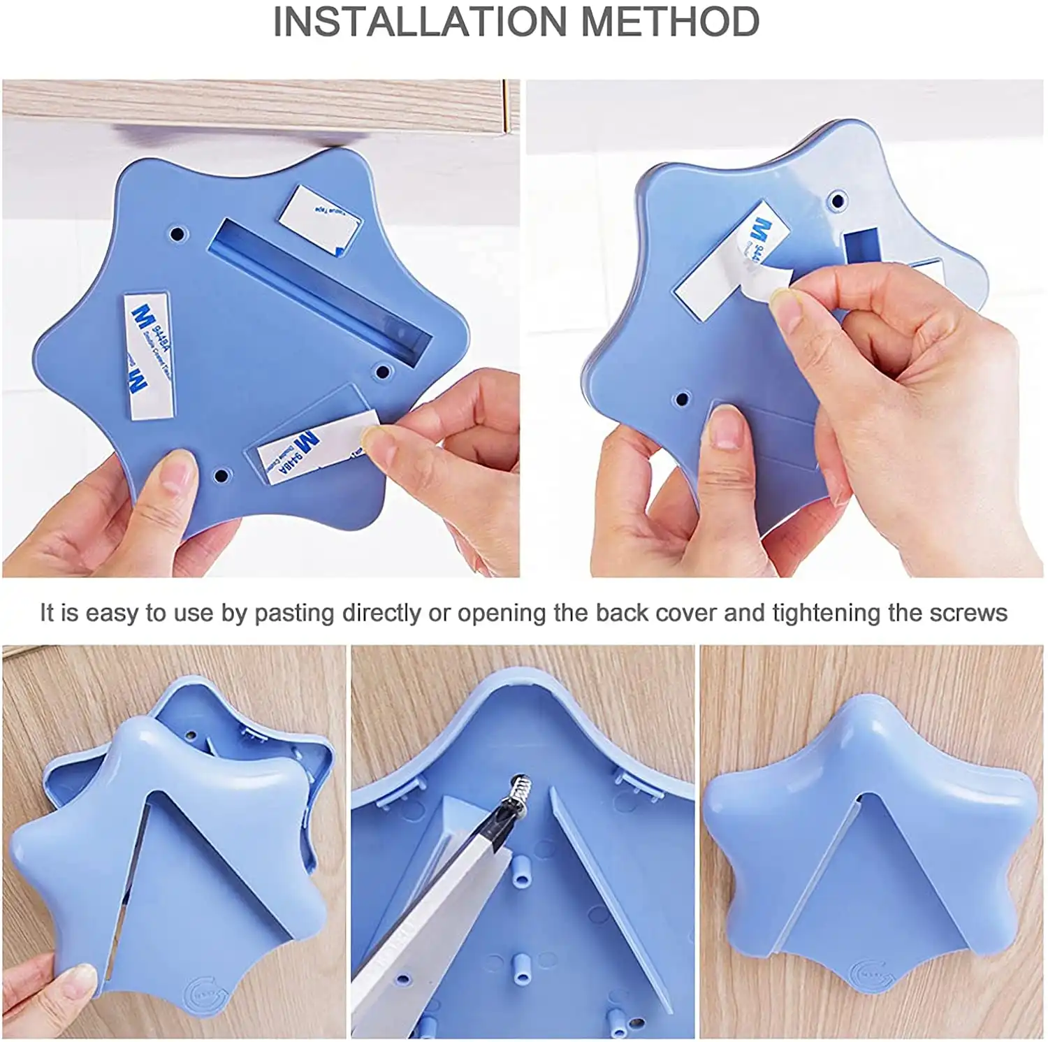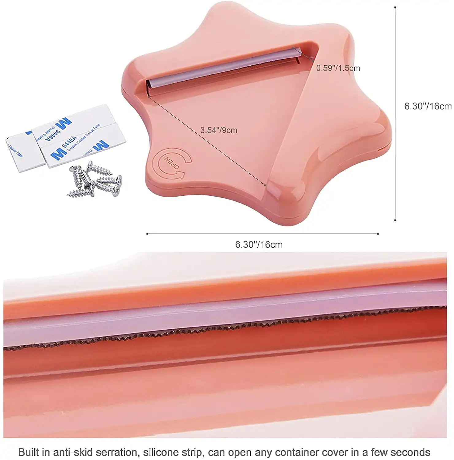 Easy to install and use. I can’t really rate the adhesion as all it had to do was to hold it up until I installed the screws. The screws were easy enough to install so I thought why not. I’m not going to move it. It works fine. Put a jar into it and turn with 2 hands. They open right up.