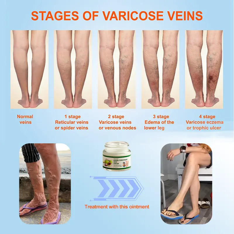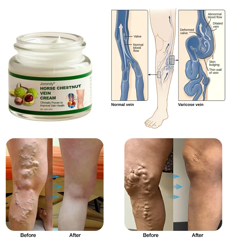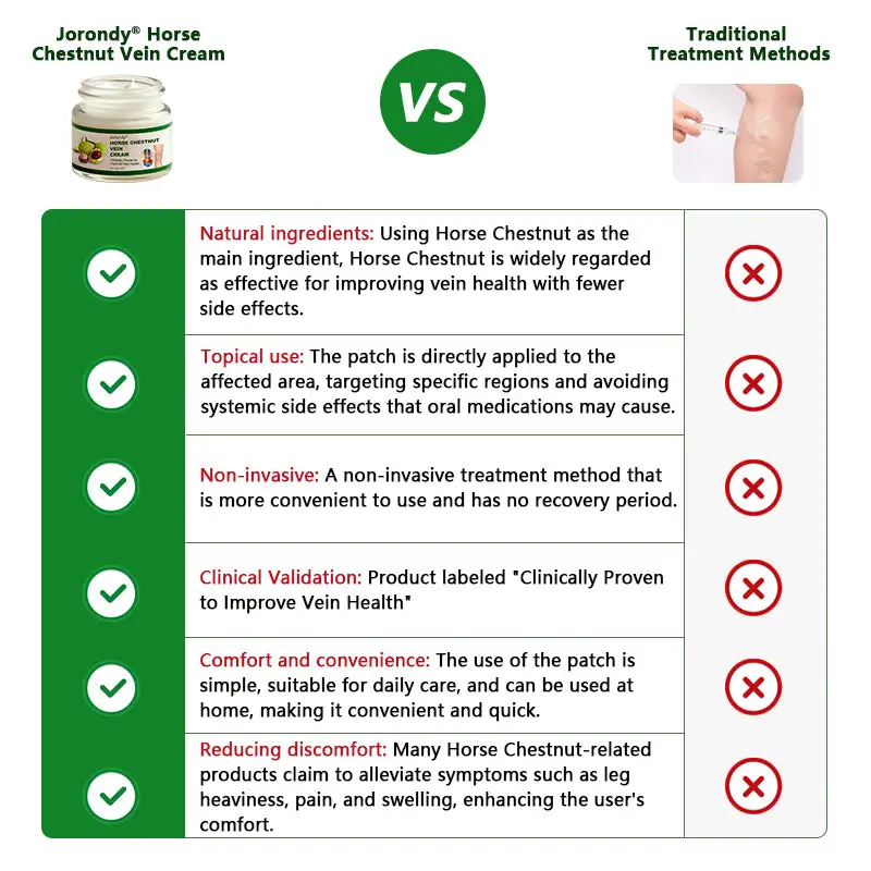 Varicose veins are often accompanied by inflammation and tissue damage. Jorondy® Horse Chestnut Vein Cream is rich in natural plant-based ingredients with anti-inflammatory and pain-relieving properties. It effectively reduces inflammation around the veins, soothing redness, burning sensations, and itching caused by varicose veins. At the same time, the nourishing components in the cream support the repair of damaged skin and blood vessels, helping to restore them to a healthier state. With consistent use, Jorondy® Horse Chestnut Vein Cream not only improves the appearance of varicose veins but also addresses the discomfort at its root.