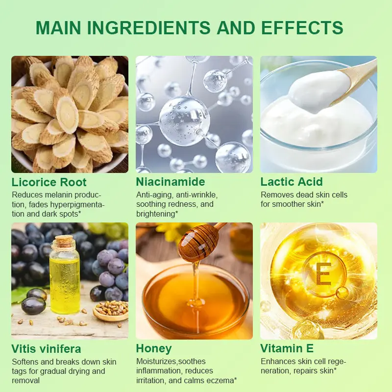 The acidity in vitis vinifera softens and breaks down the tissue structure of skin tags. causing them to dry out and eventually fall off. Vitamin E supports skin repair and reduces inflammation. Together. these ingredients not only help remove skin tags but also accelerate the healing process afterward.